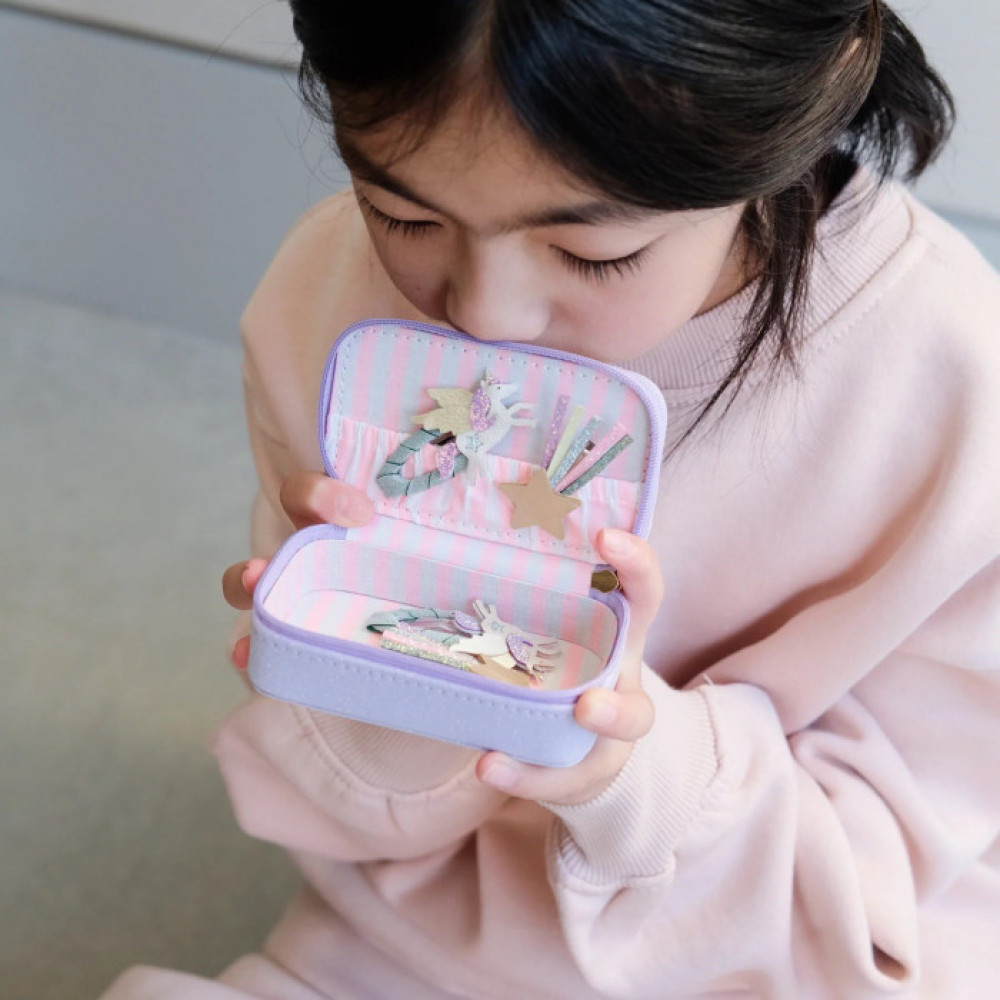 Meet our new Mini jewellery box! In the loveliest shade of lilac, it's the perfect twinkling little storage space for all those important bits and bobs! Ideal for jewellery, mini clips or ponies alike and great for taking their treasures on the go! Warning! Not suitable for children under 36 months.