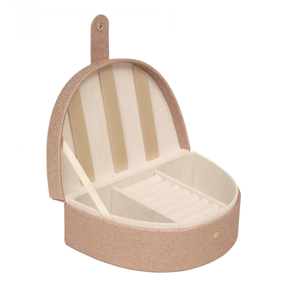 Our brand new pink rainbow jewellery box is the perfect shimmering storage solution for little accessory lovers! Crafted from glittering golds and soft pinks, this beautiful box would make the most wonderful gift! Crafted from a mix of metallic and glitter leatherette fabrics Gold metallic popper button closure Featuring ribbons for clip storage and three further spacious sections H14cm x W22cm Warning! Not suitable for children under 36 months