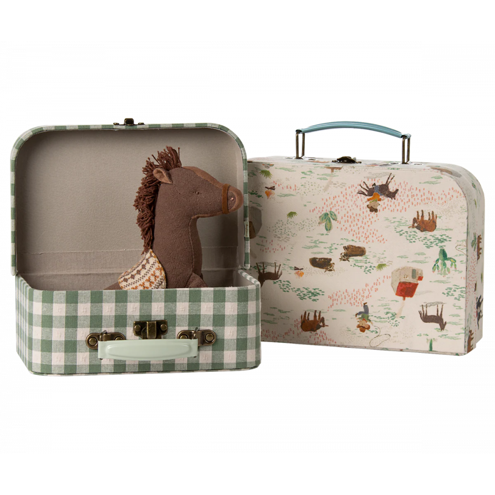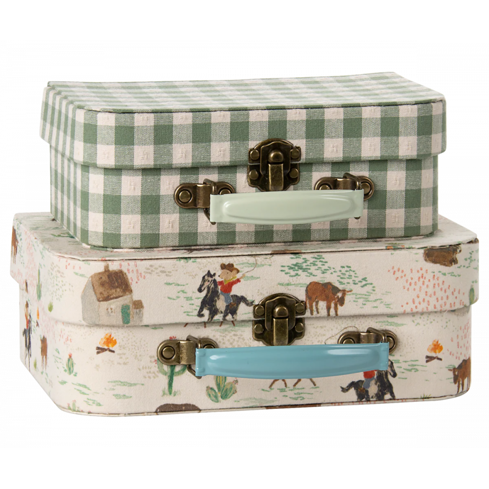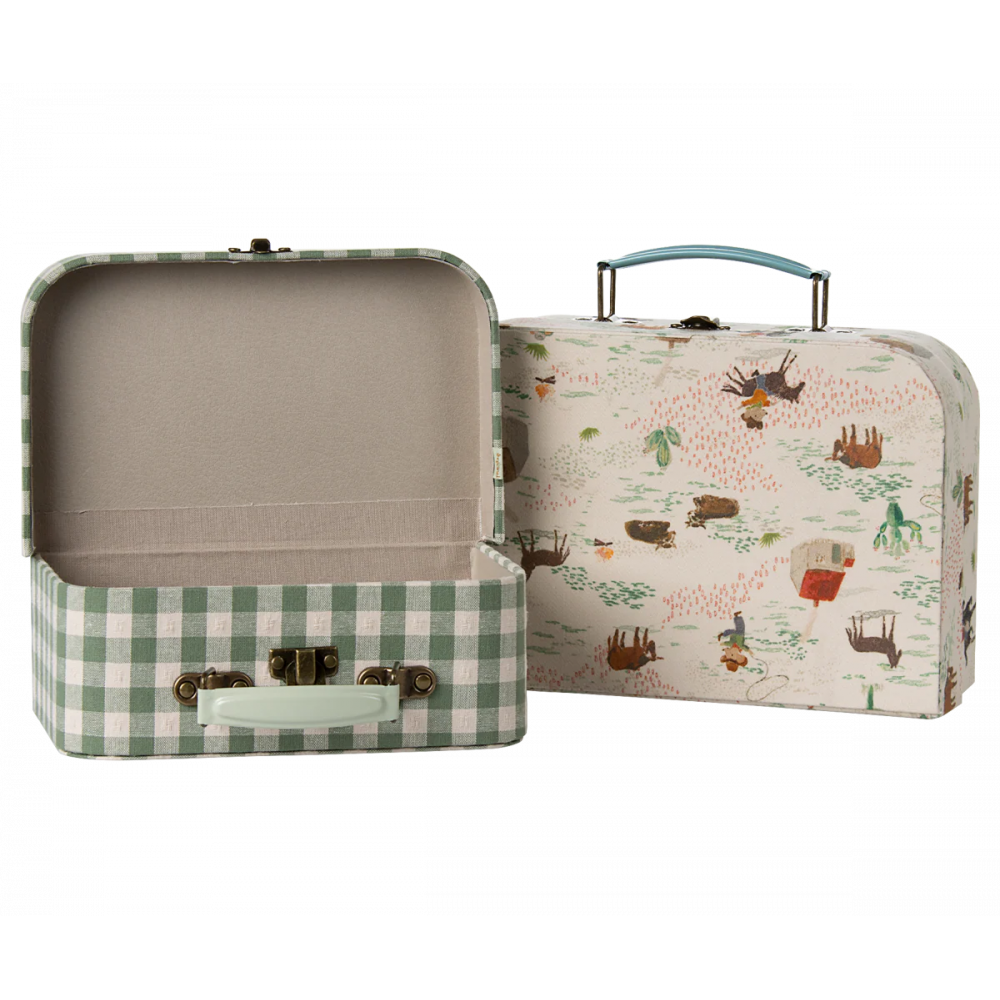 A perfect suitcase set to store all your favorite items. Each suitcase is covered by unique Maileg fabrics and has colored metal handles. This 2 pcs set is perfect for storage and for carrying your favorite toys. Height: 3.15in, Width: 8.66in, Depth: 5.91in, Net weight: 0.95lb Recommended Age +3 YEARS.