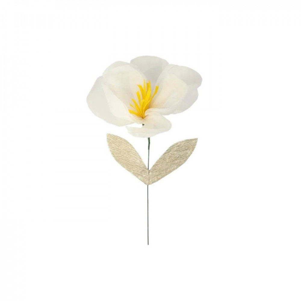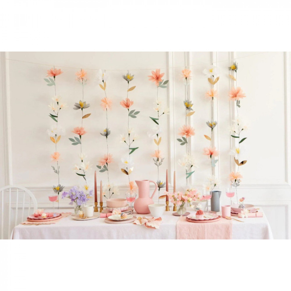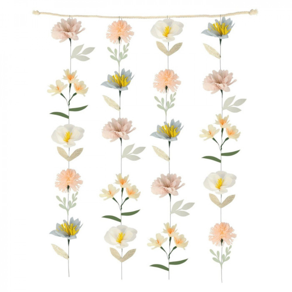 Add some garden vibe into any space with the Flower Wall | Soft Colours by Meri Meri The set includes 20 flowers in 5 designs, and 6.5ft of cord for the flowers to hang from The flowers are crafted from tissue paper in pale yellow, pink, blue, peach, dusky blue and dusky pink Leaves, crafted with gold foil and green with gold foil detail, look amazing The flower stems have a hook on the end so they can attach to each other to create different lengths The set comes with easy-to-follow instructions, and is well packaged with the flowers protectively wrapped in tissue paper