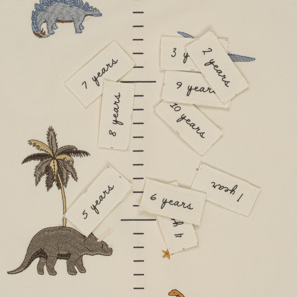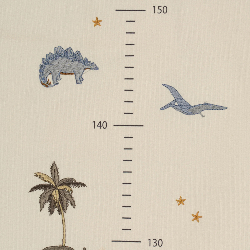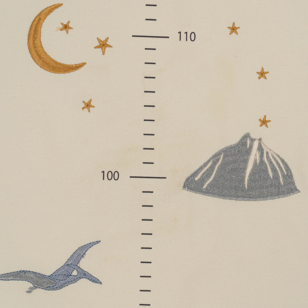 Height chart made in 100% cotton with a beechwood stick. Designed with embroidery and a practical rope at the top of the chart to hang wherever you please. Each chart comes with a set of labels to iron on to the chart showing your child's height at different ages (1 - 10 years). H: 160 cm