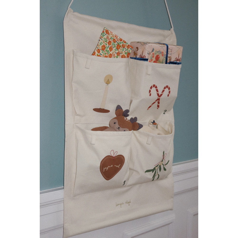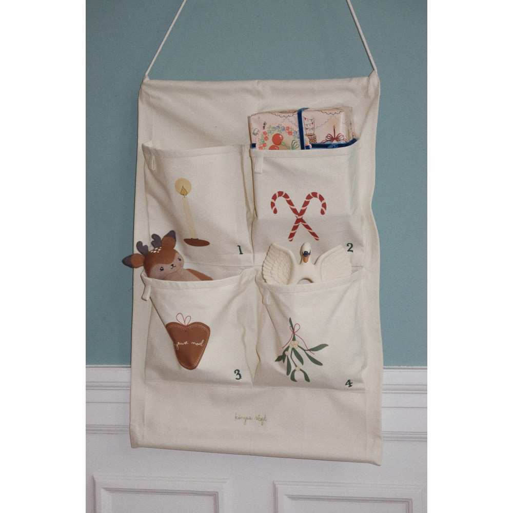Christmas calendar with holiday prints and 24 pockets to hide little presents in. Features a practical rope at the top of the chart to hang it with. Made from 100% cotton with a 100% beechwood stick W: 70 L: 120 cm For decoration only