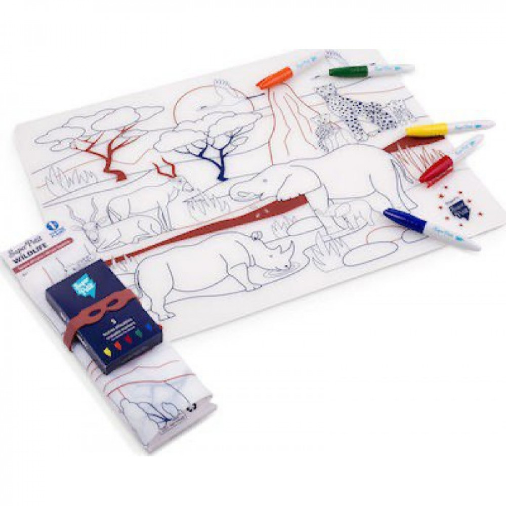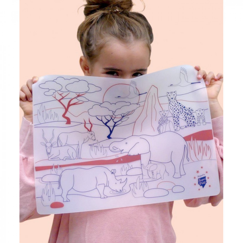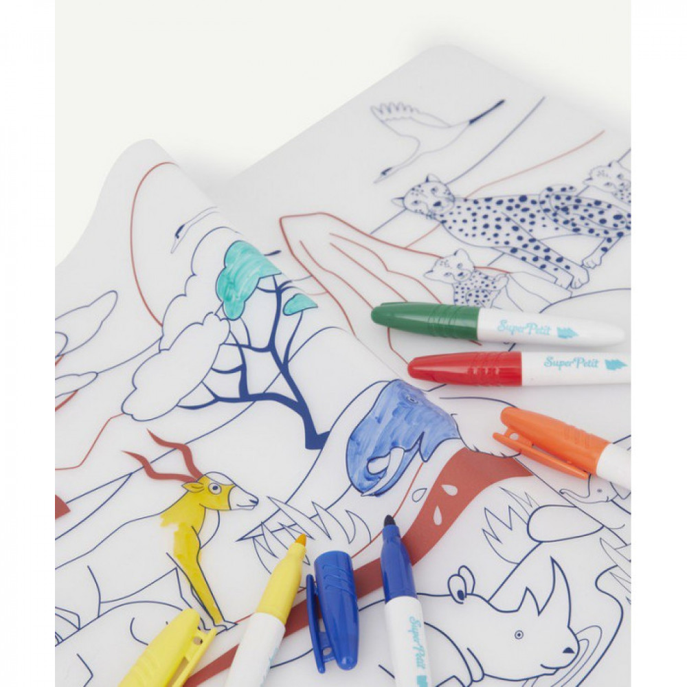 We love the creative and fun design that will accompany your child to the table, and the graphics are signed Super Petit. The little extra : the bracelet in the shape of a mask that your little hero can wear proudly! This very easily foldable set This easily foldable set will follow your little artist to all his meals. Details : 1 Table set, 5 erasable pen(s), 1 bracelet, Non-porous and anti-bacterial, 100% recyclable.
