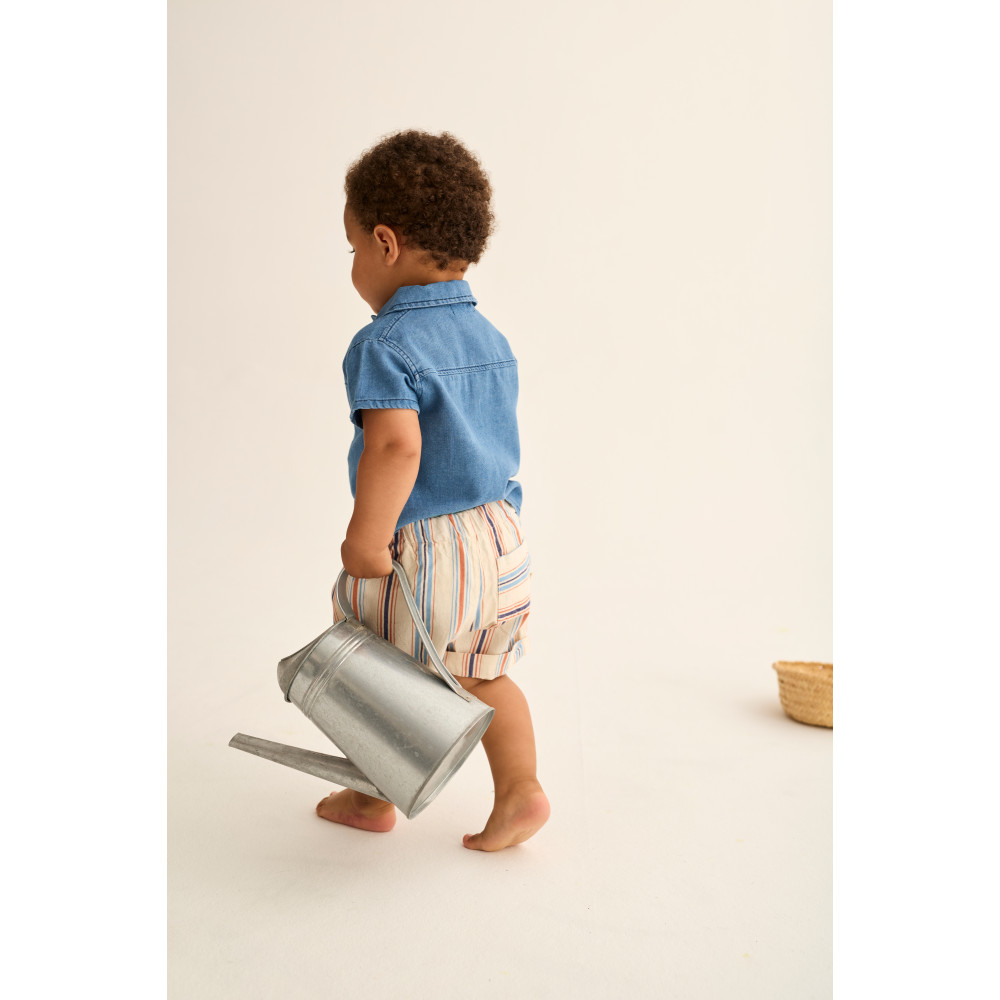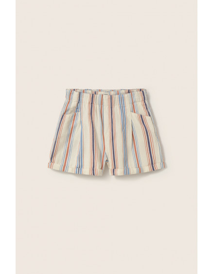 Striped shorts made of soft and comfortable cotton. Elastic waistband. Front pockets lined with "Cozmo" fabric. Back patch pocket with horizontal stripes. Rolled-up hems. Pleated at the front.