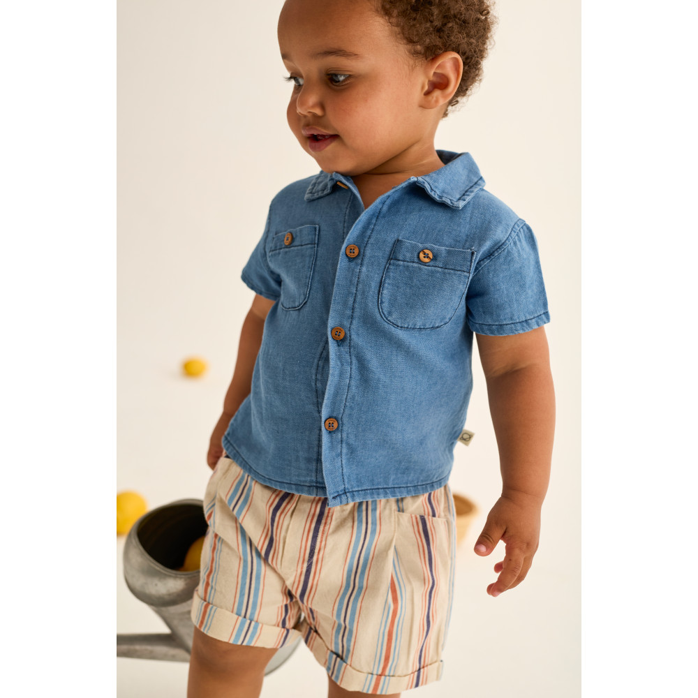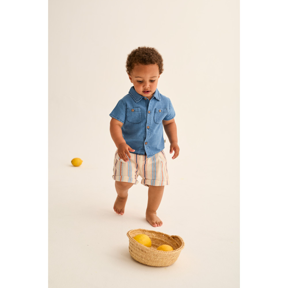 Striped shorts made of soft and comfortable cotton. Elastic waistband. Front pockets lined with "Cozmo" fabric. Back patch pocket with horizontal stripes. Rolled-up hems. Pleated at the front.