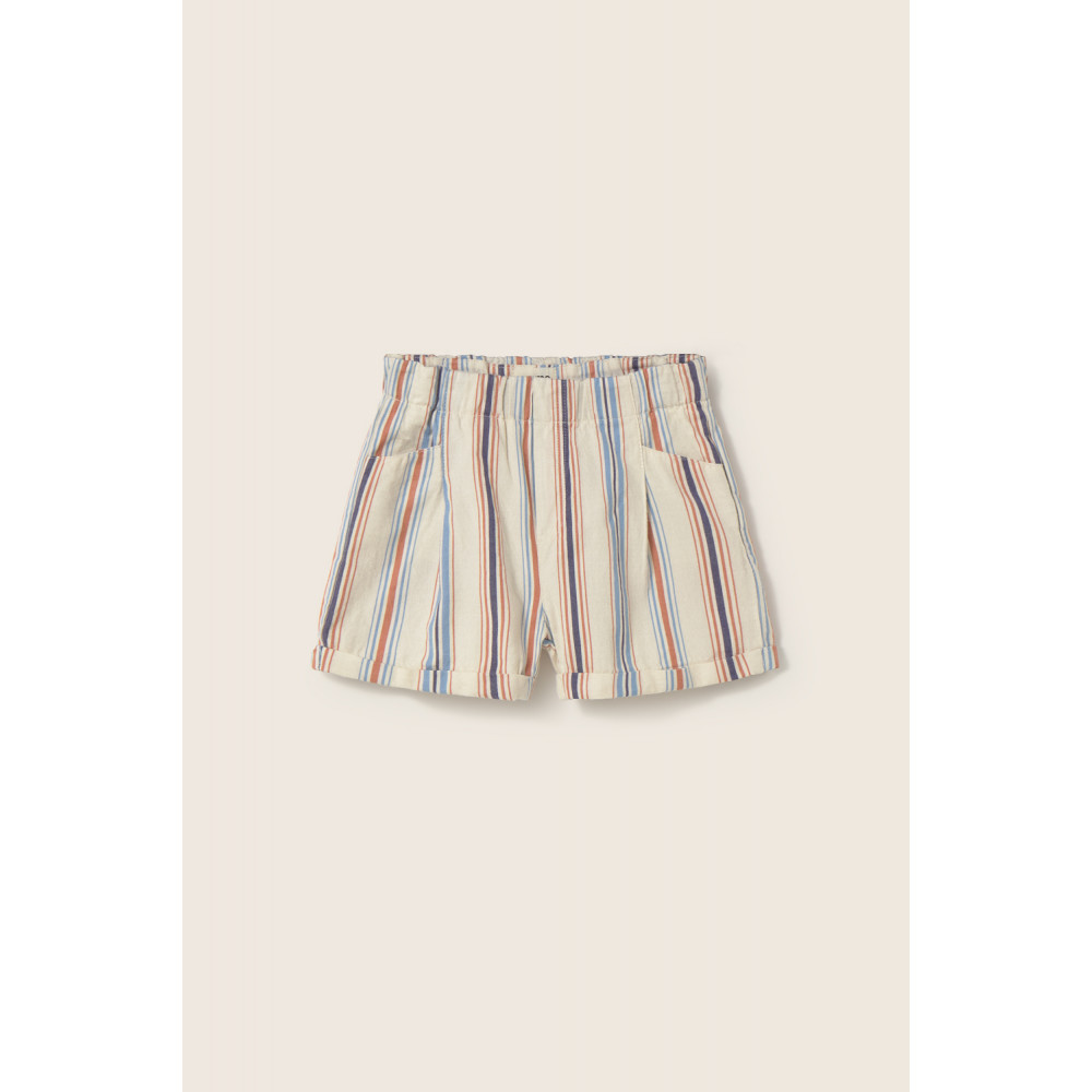 Striped shorts made of soft and comfortable cotton. Elastic waistband. Front pockets lined with "Cozmo" fabric. Back patch pocket with horizontal stripes. Rolled-up hems. Pleated at the front.