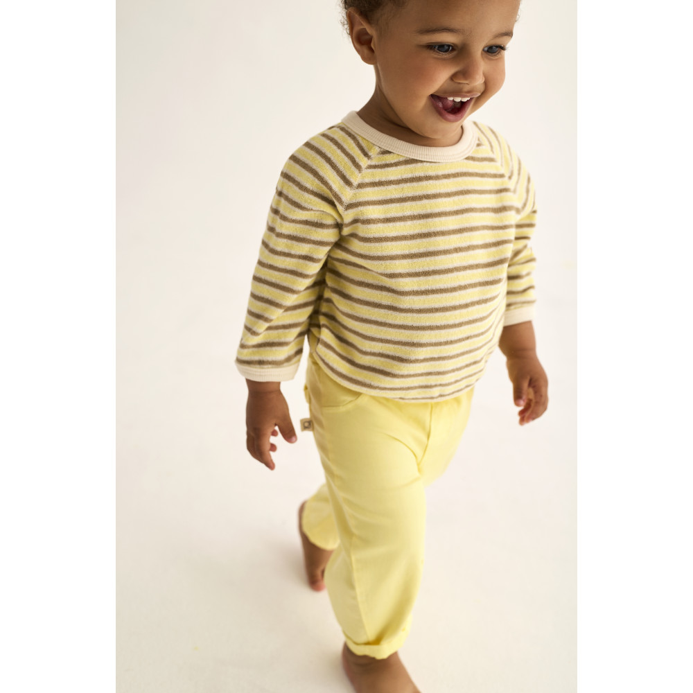 Striped sweatshirt made of soft terry cloth. Crew neckline. Raglan long sleeves. Rib at the neck, cuffs, and hem.