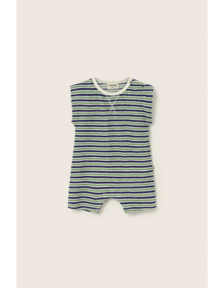 Striped romper made of soft terry cloth. Crew neckline. Snap buttons on the left shoulder and at the gusset. Dropped shoulders. Smocked at the waistline and elastic at the leg openings.