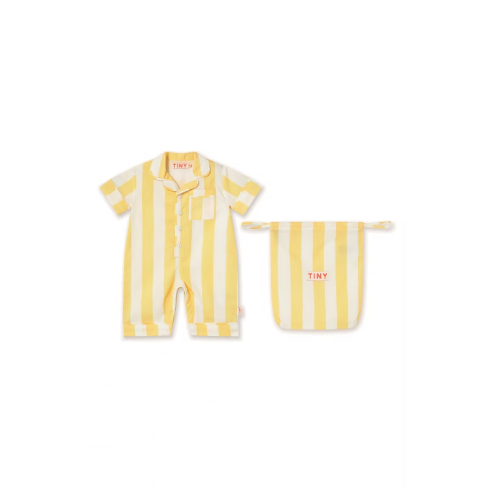 This yellow stripes printed one-piece is made from 100% cotton and features a relaxed, comfortable silhouette. It comes with short sleeves, a small front chest pocket, a front button closure, and snap buttons at the bottom for easy dressing. It also includes a matching bag, perfect for storing the garment.