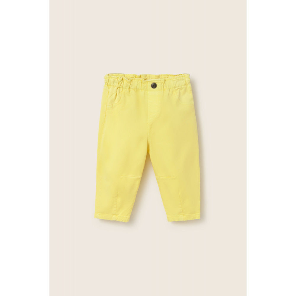 Pants in comfy and elastic cotton twill. Elastic adjustable waistband. Decorative button and mock fly. Yoke at the back. Fake pockets at front and two back patch pockets. Creases at front and back.