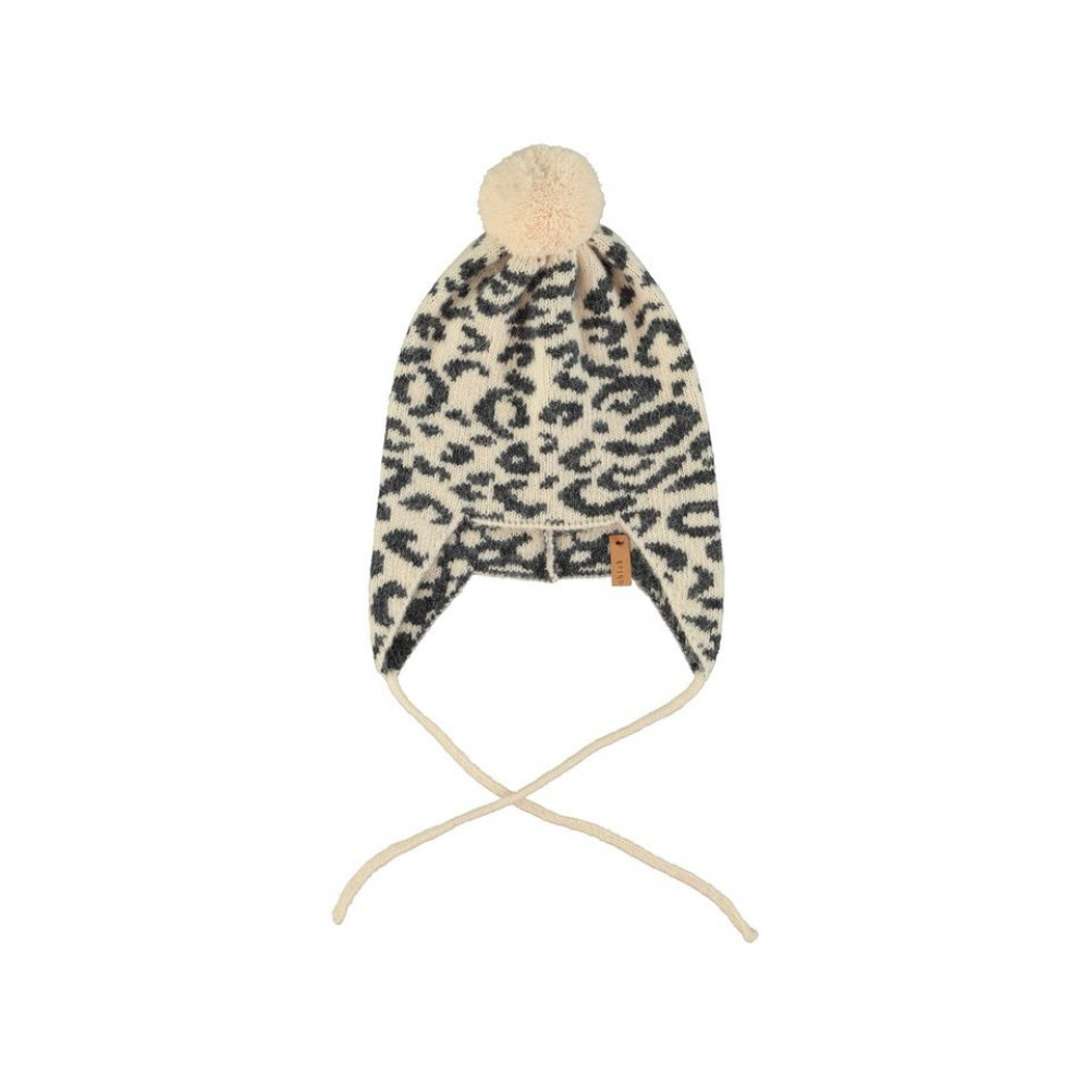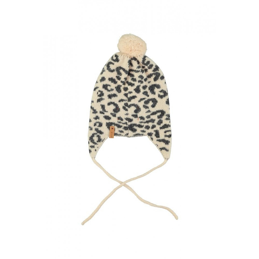 Knitted baby hat with pompom, ear flaps and detailed with leather logo label. Made in Portugal
