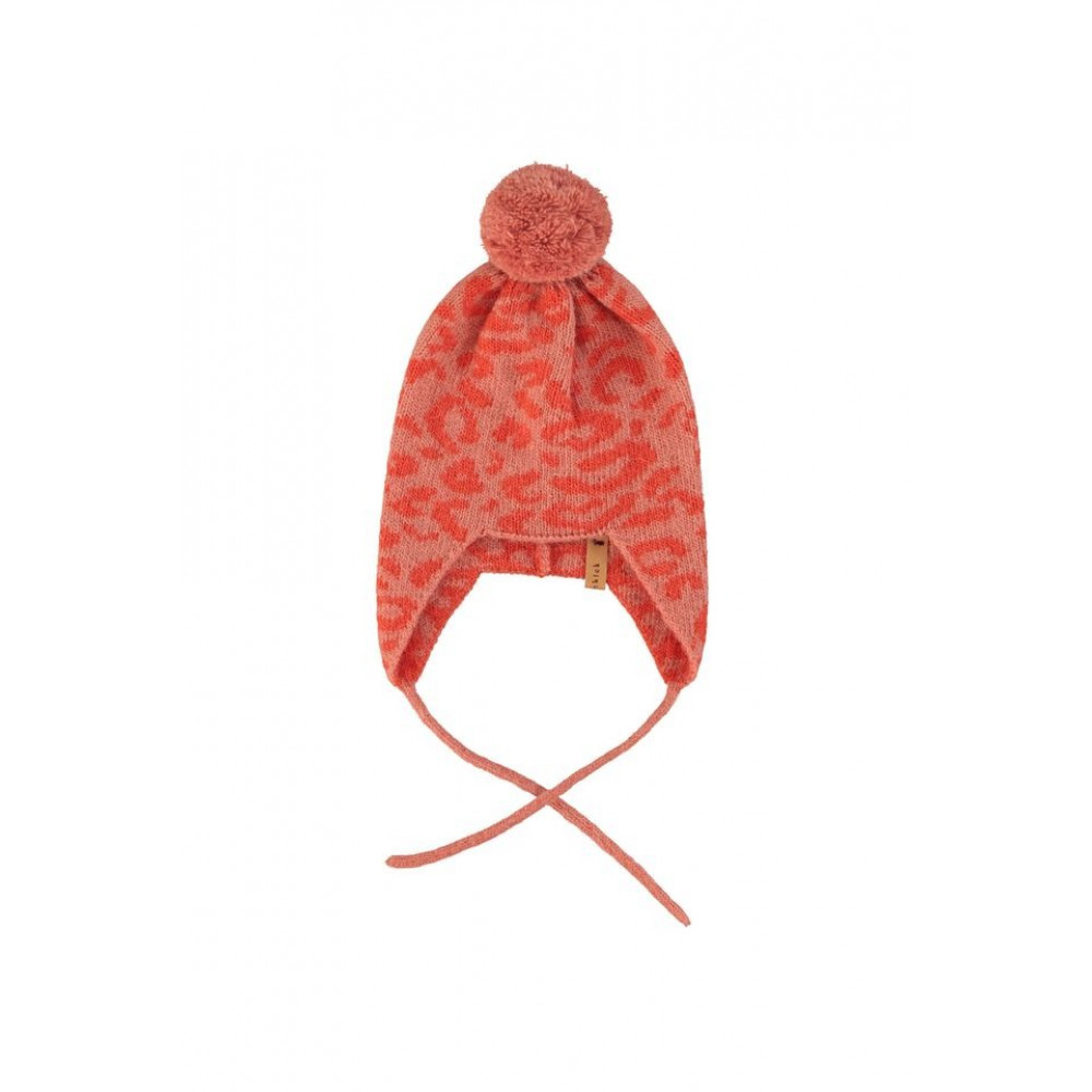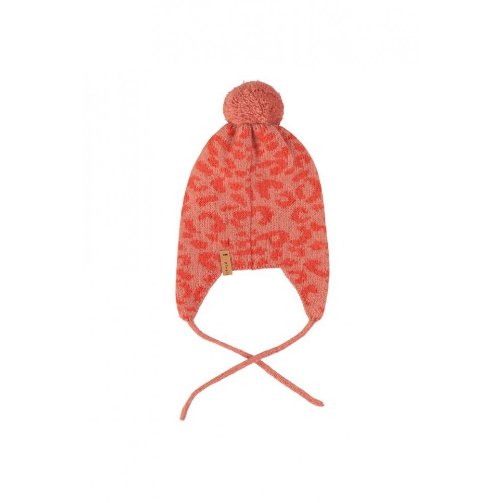 Knitted baby hat with pompom, ear flaps and detailed with leather logo label. Made in Portugal