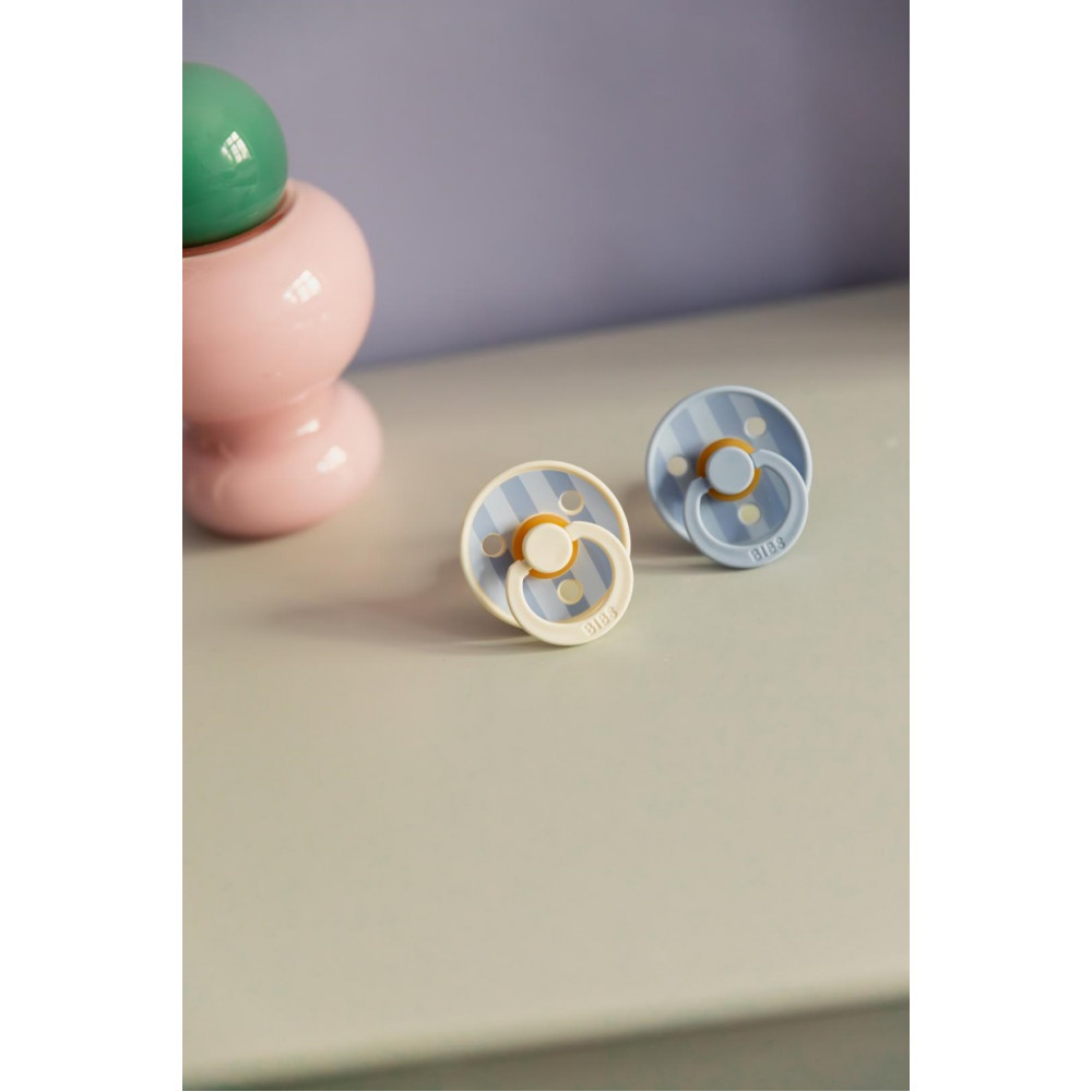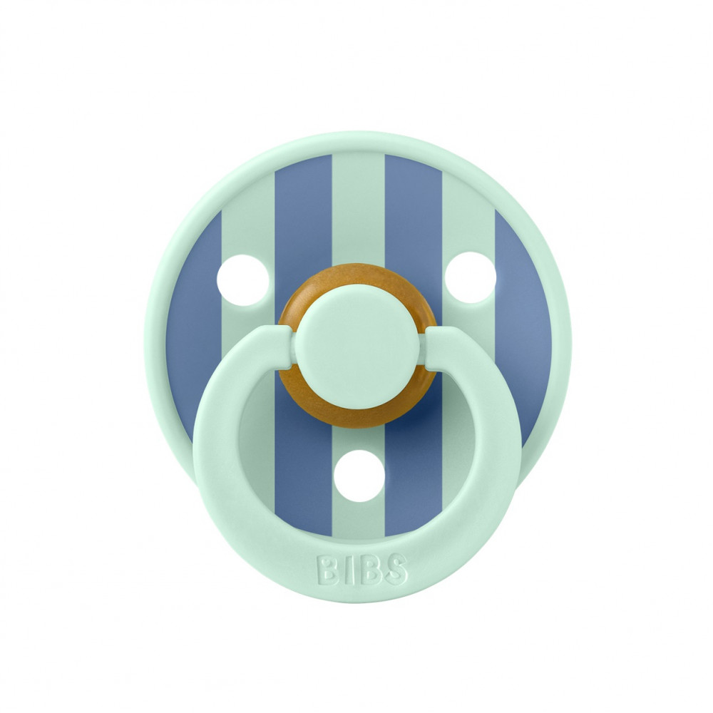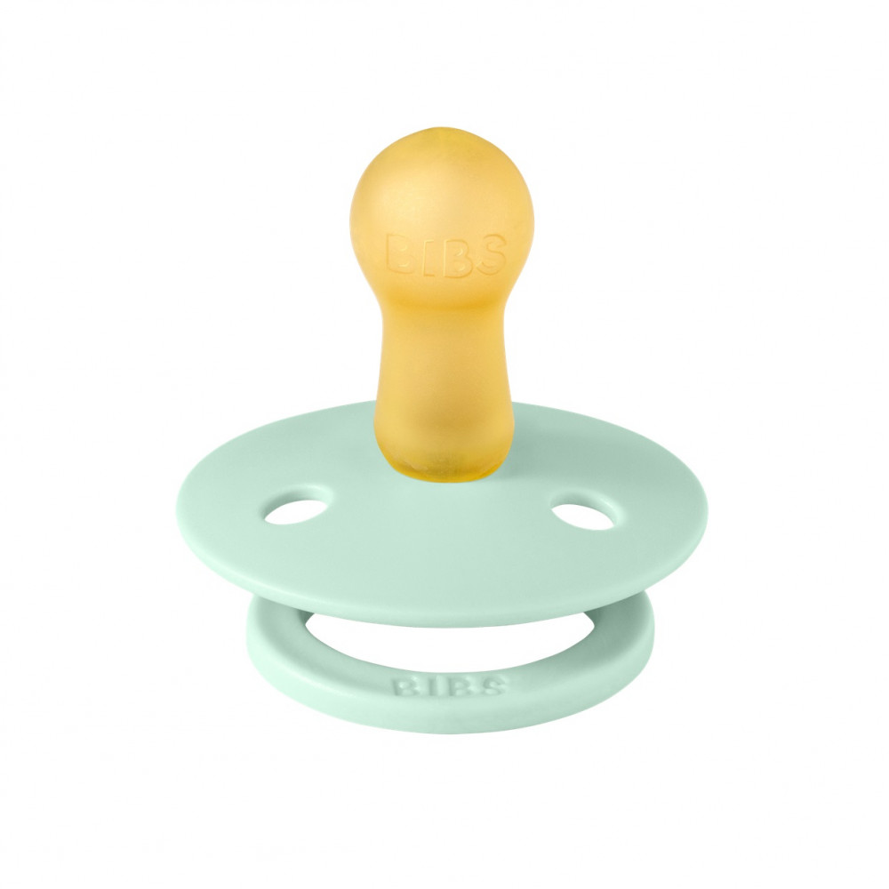 BIBS Colour is the original BIBS pacifier, which has been on the market for over 40 years. The anatomical nipple is designed as the perfect combination of a round and a symmetrical nipple. Round on top to support the natural sucking reflex and flat on the bottom for comfortable placement. The sucking technique does not require as much force as, for example, a round pacifier. The Colour pacifier features the signature BIBS round shield with three vents and a round handle ring with BIBS engraving. The shield is carefully designed to cover the sensitive and delicate skin around your baby's mouth to prevent moisture build-up. The shield comes in one size, regardless of nipple size.