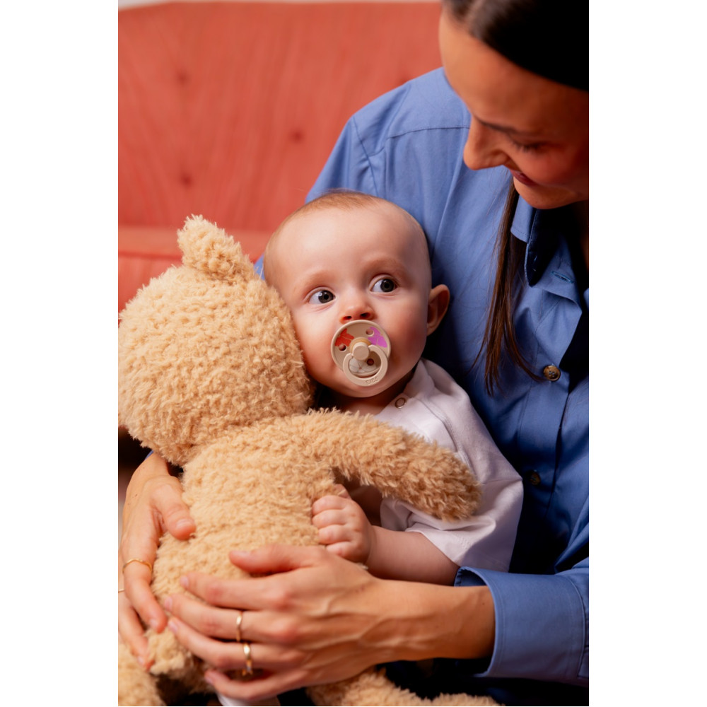 BIBS Colour is the original BIBS pacifier, which has been on the market for over 40 years. The anatomical nipple is designed as the perfect combination of a round and a symmetrical nipple. Round on top to support the natural sucking reflex and flat on the bottom for comfortable placement. The sucking technique does not require as much force as, for example, a round pacifier. The Colour pacifier features the signature BIBS round shield with three vents and a round handle ring with BIBS engraving. The shield is carefully designed to cover the sensitive and delicate skin around your baby's mouth to prevent moisture build-up. The shield comes in one size, regardless of nipple size.