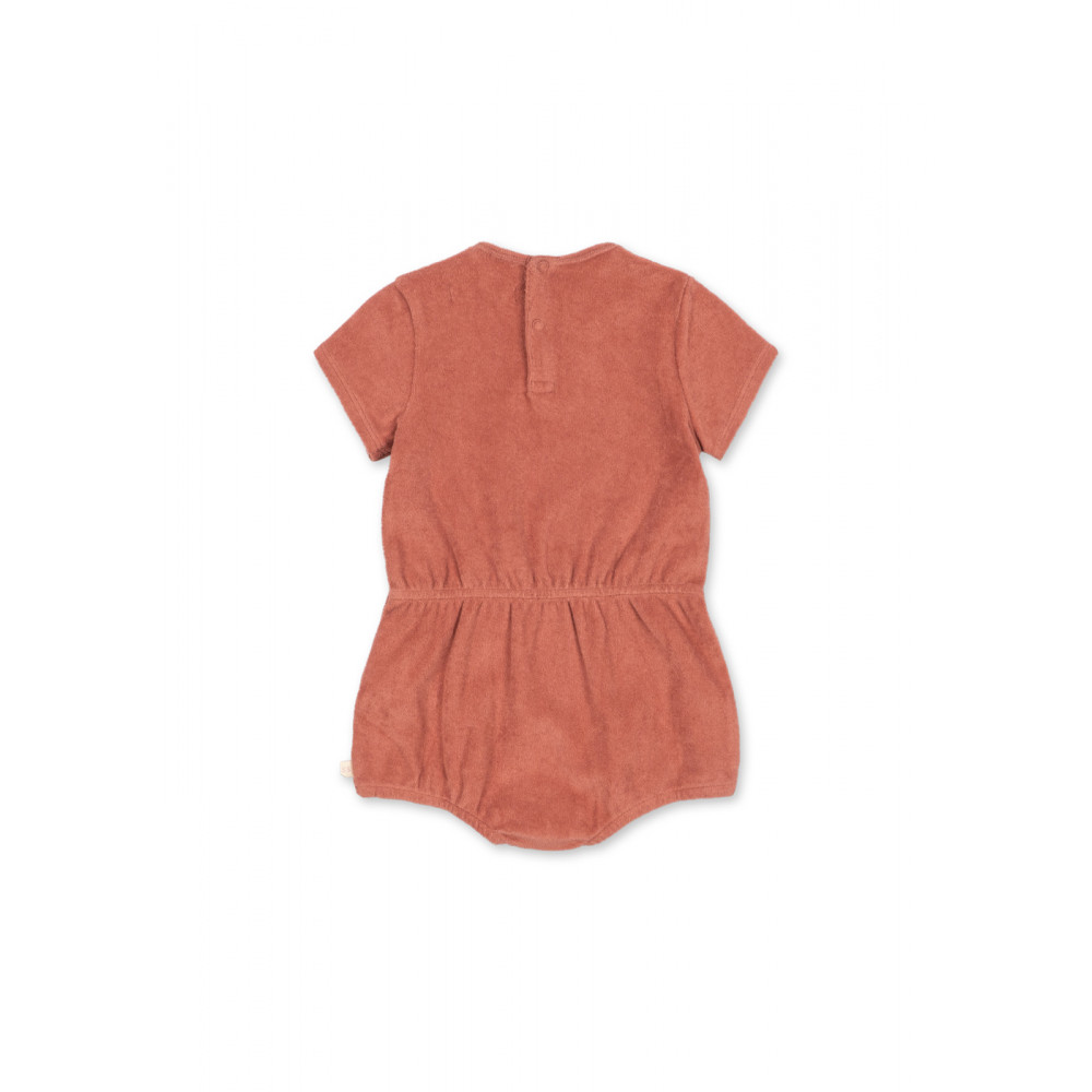 Romper made in soft terry fabric. Designed with snap buttons at the legs for easy dressing as well as comfy elastic bands around the leg openings for a comfy fit.
