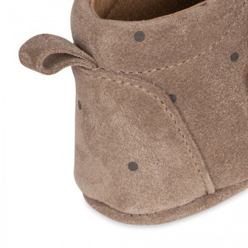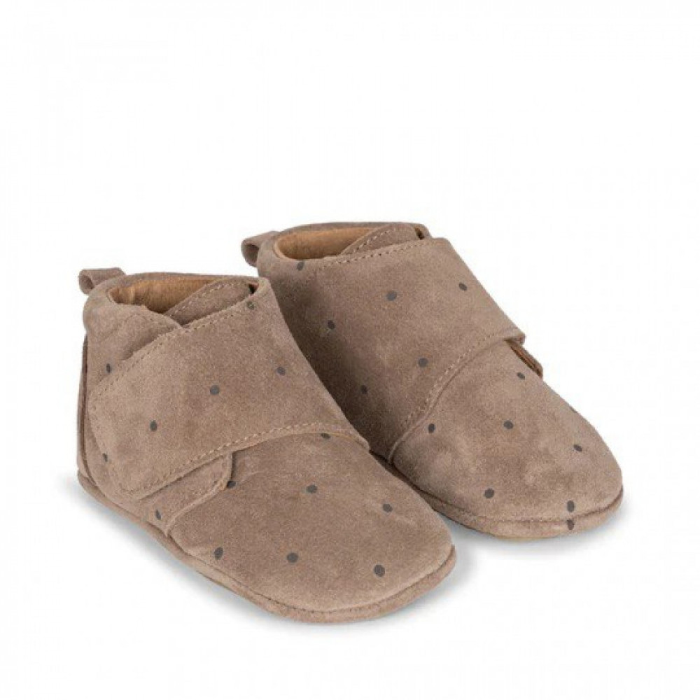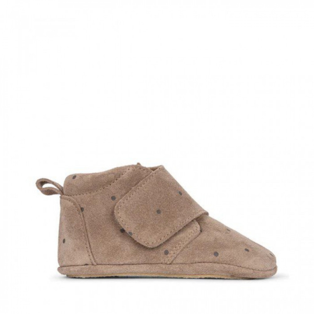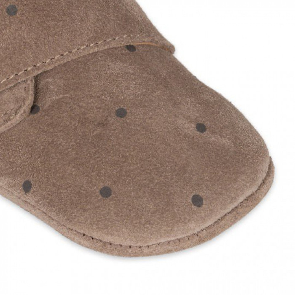 Suede and printed leather footies with natural crepe rubber and padded removable insole for indoors. Designed with an ergonomic shape for growing feet.