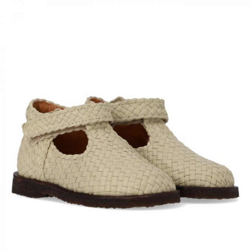 Hand-braided leather beginner's Mary Jane. The Mary Jane features a T-strap and adjustable velcro strap, fixed heel cap with padded collar for extra comfort, stability and support, padded insole, chrome-free leather lining and a light, soft and flexible dark brown renewable natural rubber sole adorned with decorative contrast stitching. The upper part of the shoe is crafted in natural vegetable tanned leather and is hand-woven in India, making each pair unique. Colour and pattern may vary. Treat them with care. Crafted in natural and breathable leather. Designed in Denmark and handcrafted with love in Portugal. Always measure the child's foot before buying to ensure you get the right size. We recommend a growth allowance of 1 cm.