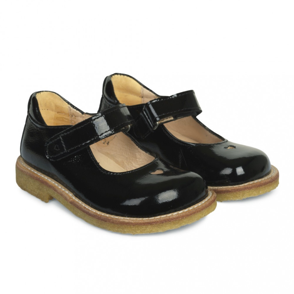 Classic Mary Jane with a sapcious fit and the distinctive cut-out heart motif on the front. The shoe features an adjustable velcro strap, embossed logo and a light, soft and flexible crepe rubber sole in renewable natural rubber carved for extra arch support. The shoe has a padded insole, chrome-free leather lining and a fixed heel counter with a padded collar for extra comfort and support. Crafted in natural and breathable leather. Designed in Denmark and handmade with love in Portugal. Always measure your child's foot before buying to ensure you get the right size. We recommend a growth allowance of 1-1.2 cm.