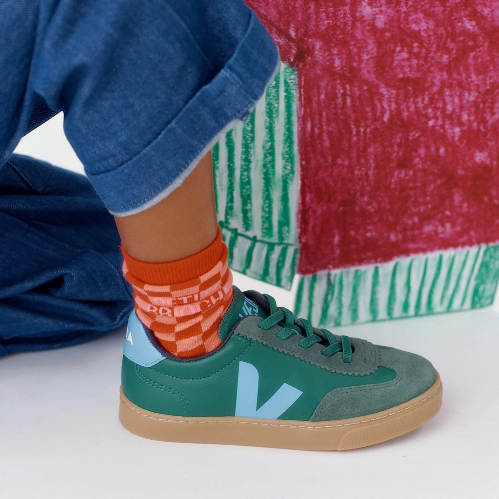 The Volley stands out with its integrated elastic lace system, allowing children to put on and take off their sneakers without having to tie or untie laces. The leather used comes from farms in southern Brazil and Uruguay, tanned in workshops selected for their environmental standards. The rubber in the sole is sustainably harvested in the Amazon from seringueiro communities.