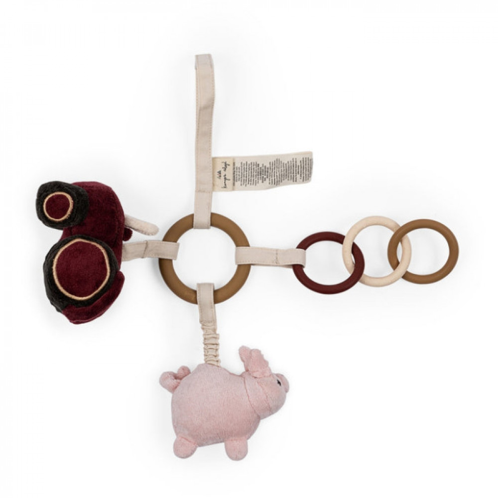 Activity rings made in 100 percent silicone, safe for babies to chew on. The rings have organic cotton straps with soft figures added on to them, made in organic cotton with recycled polyester filling inside. One ring is textured and one strap is elastic, designed for babies to develop tactile senses. The activity ring also has a strap to hang the toy.