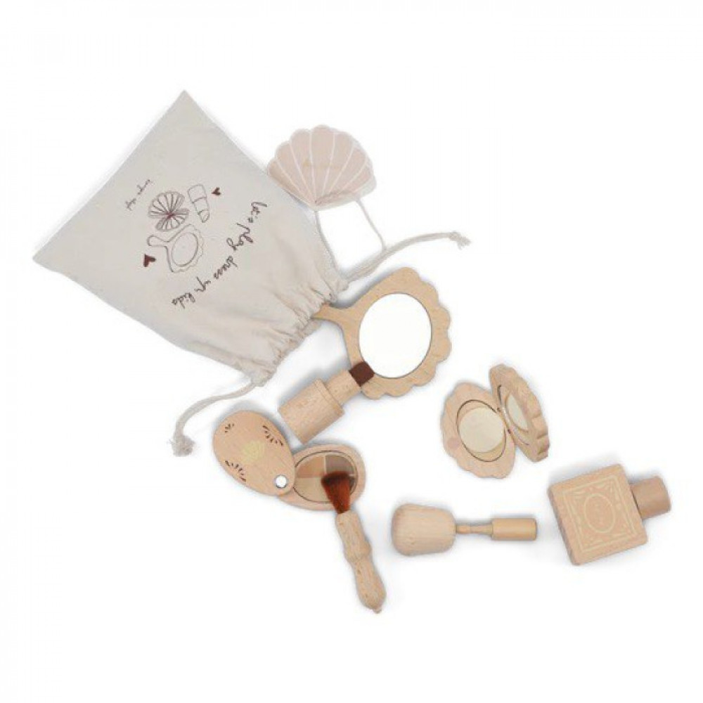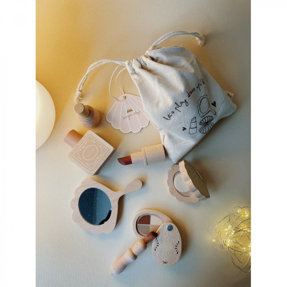 This cute little makeup set is perfect for play and dress up. It comes in a little cotton bag and consists of 7 pieces: lipstick, mirror, bottle, nail polish, rouge with mirror, eye shadow and a brush.