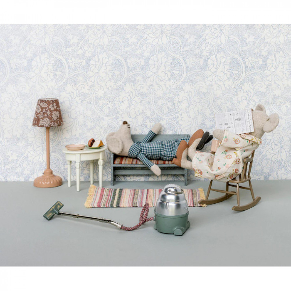 A wooden bench made to fit the mouse family perfectly. It has a beautiful hand painted vintage look - variations may occur - and a soft cushion on top of the bench for a comfortable seat.