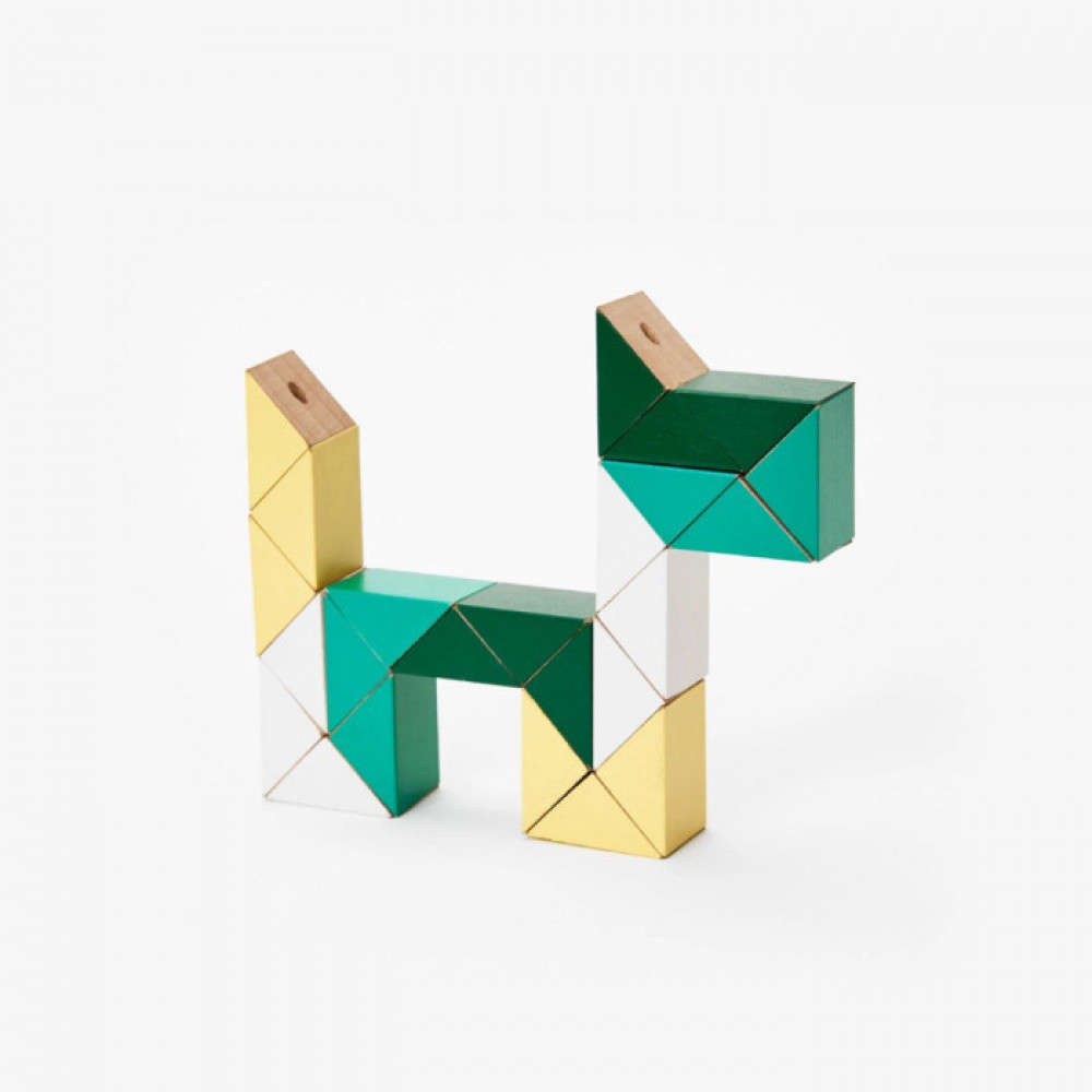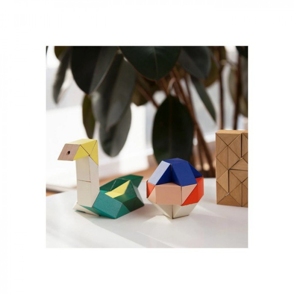 SNAKE BLOCK™ is a classic articulated object, reinvented from wood and elasticity. Twist and turn the multi-colored blocks to create endless shapes, snake-like figures and geometric designs, including a sphere, a swan, a dog or even a fish. SNAKE BLOCK consists of 24 painted wooden triangles connected by elastic bands. Inspired by Japanese SK puzzles, SNAKE BLOCK comes to life and finds its balance in the many positions allowed by the elastic connection. But they can also fold into a perfect rectangle and quietly await other adventures. Already a great classic for discerning collectors. 47 x 2,5 x 1,7 cm