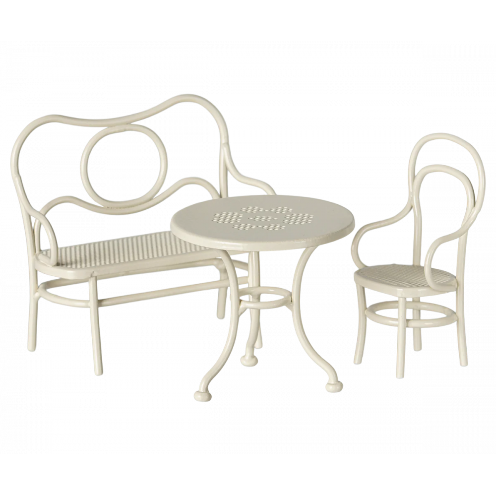Café set furniture that fits the Little sister/brother and Big sister/brother mice. The set consist of a bench, a chair and a table, and is a perfect place for enjoying the afternoon sweets. Height: 8.50cm, Width: 9.00cm, Depth: 4.50cm, Net weight: 0.12kg