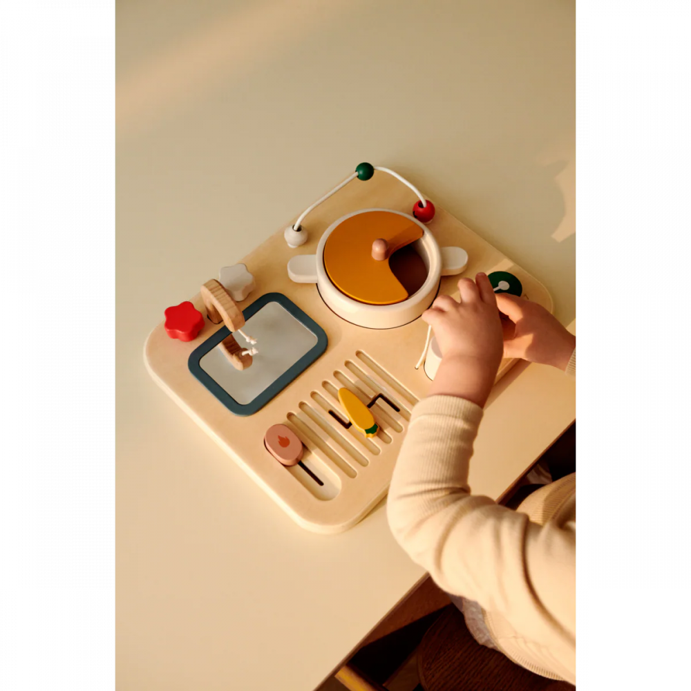 The fun MAGNUS wooden busy board invites budding chefs to stir, shake, and sizzle their way through sensory play. Made from durable beech wood and MDF, this sensory activity board sparks curiosity with a spinning pot lid, rattling salt and pepper shakers, and a playful mirror sink, encouraging the development of fine motor skills. A fun activity board for future little chefs Made from durable beech wood and MDF Move the carrot on the grill and spin the pot lid to discover what is cooking Salt and pepper shakers make a rattling sound Turn the knobs and use the sink as a mirror Ideal for curious toddlers of 18+ months Height (Cm) 7.8; Width (Cm) 31.5; Length (Cm) 25.5