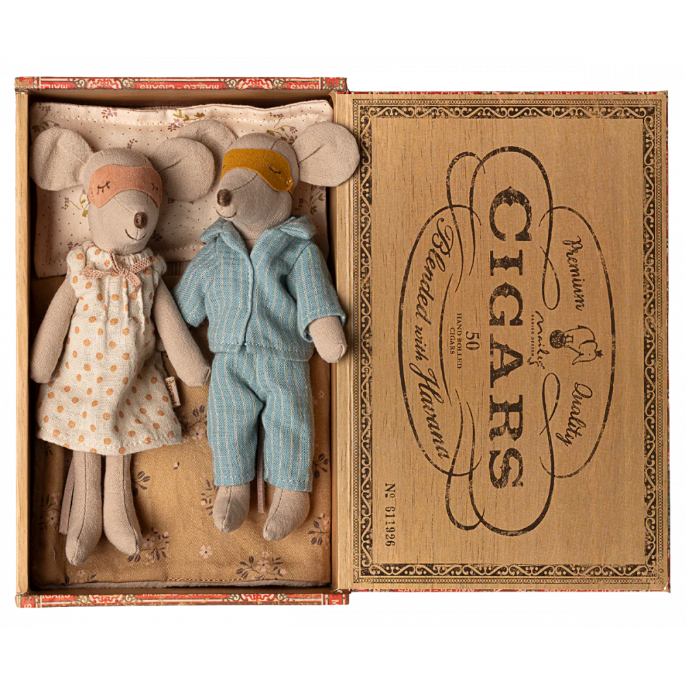 A classic Maileg item. Mum and Dad mice are wearing their beautiful nightwear and eye masks. The cigar box is a perfect bed for a good night’s sleep and sweet dreams. Sizes Height: 16.00cm, Net weight: 0.30kg