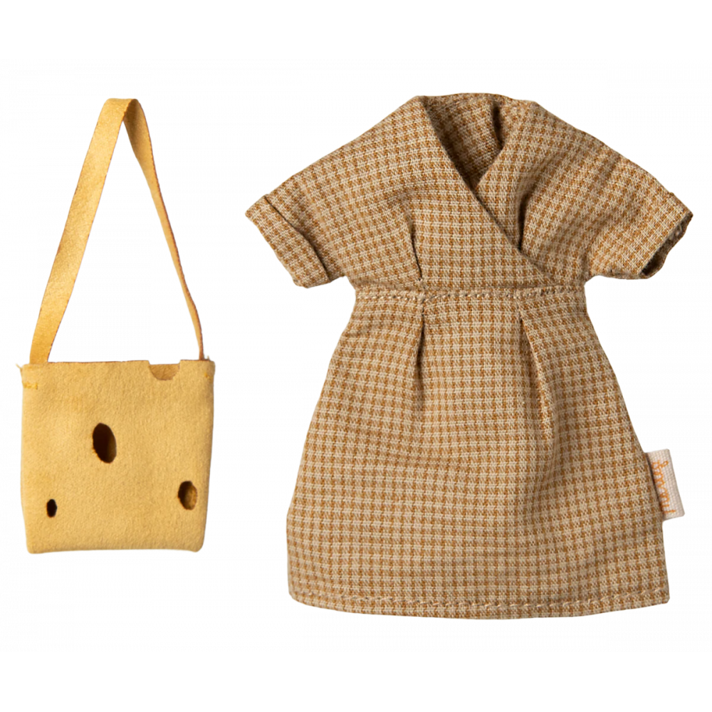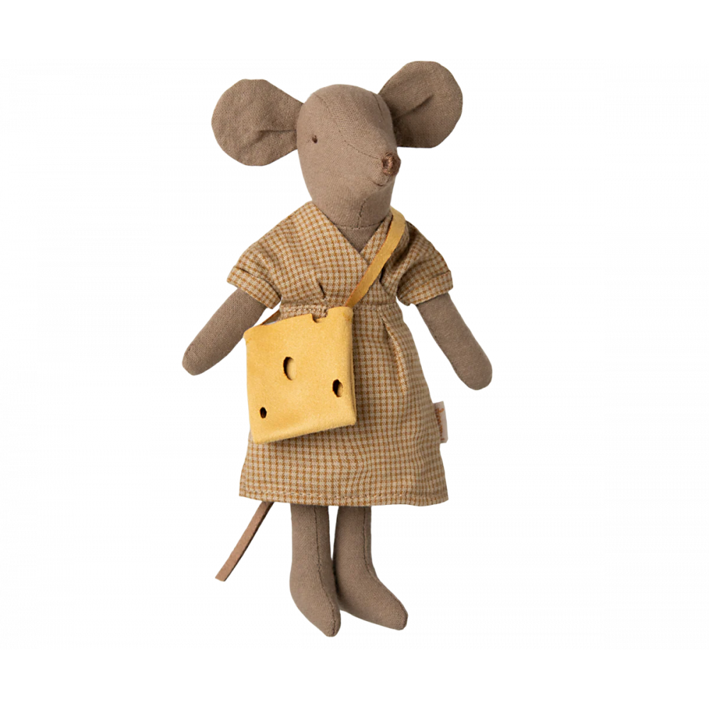 Mum mouse in light brown body fabric. She wears a dress and a bag with cheese holes. This mouse fits furniture and accessories in size mouse. Buy more clothes separately, clothes in size mum/dad fits this mouse. Height: 15.00cm, Net weight: 0.02kg