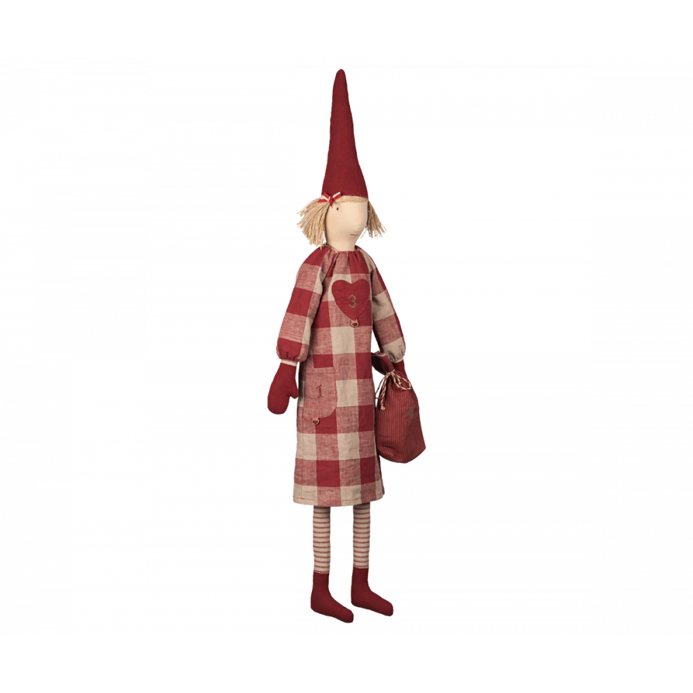 December is full of family traditions and this calendar pixy can be your next. The Advent calendar girl has 4 rings/pockets to fasten small treats - one for the 4 last Sundays before Christmas. It has a strap in the neck, so it is easy to hang up. Dimensions Height: 42.13in, Net weight: 1.04lb