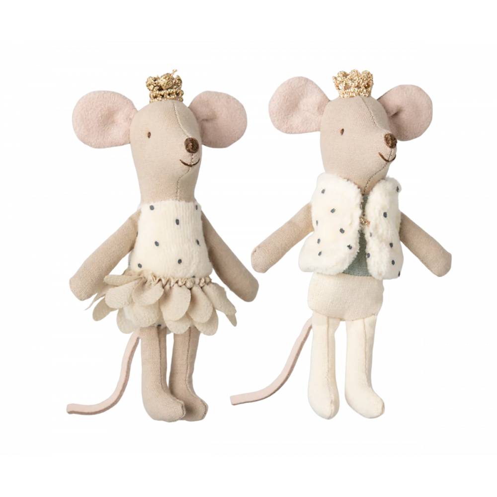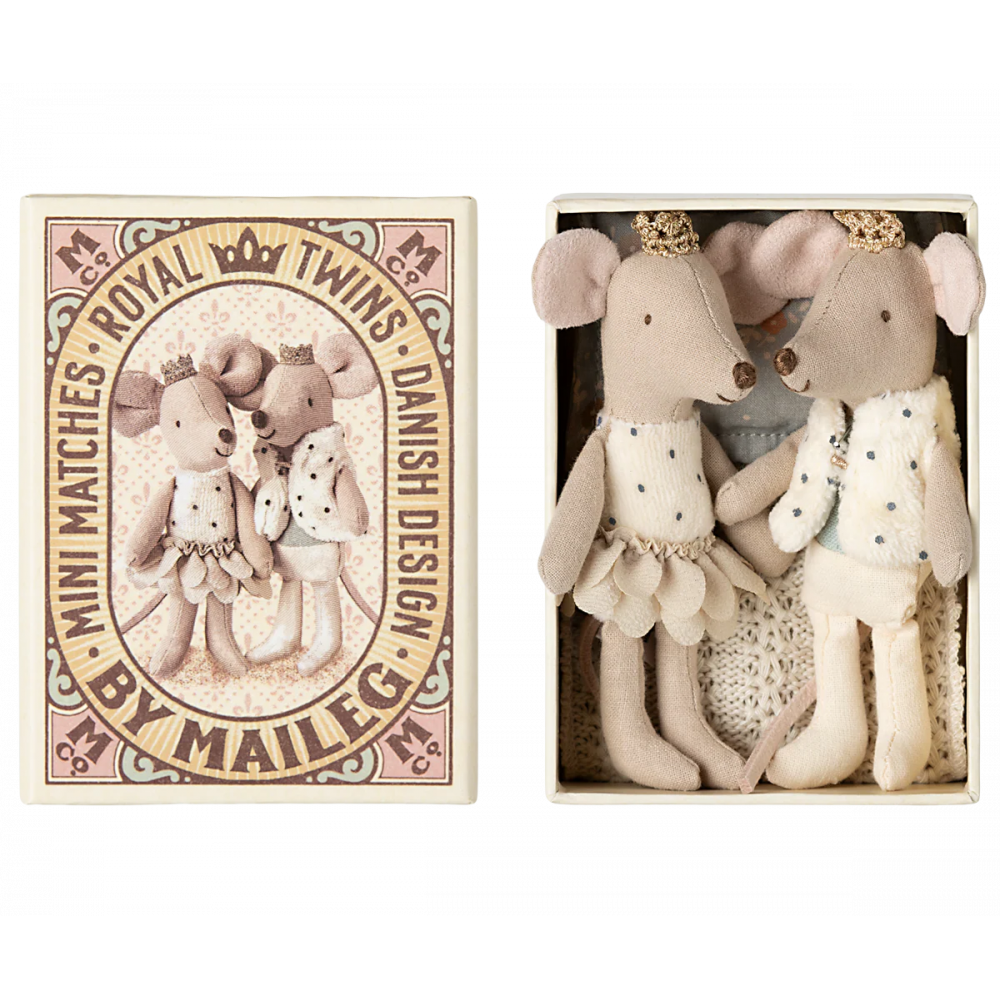 The royal twin mice is a set of a small princess and prince. They wear golden crowns and beautiful clothes. They sleep in a lovely decorated matchbox with a picture of themselves on the front. Inside the box you find the softest beddings. Dimensions Height: 4.33in, Net weight: 0.22lb