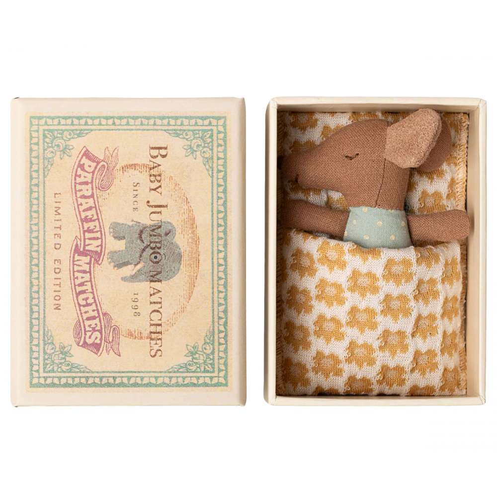 A Maileg favourite, this Baby Mouse comes tucked inside his very own matchbox bed. Dressed in a cosy spotted suit with a blue bow, he rests on soft patterned bedding, ready for sweet dreams. His face is double-sided, with one side sleepy and the other wakey, so you can choose whether he is ready for a peaceful slumber or a day of play. Dimensions Height: 3.94in, Net weight: 0.13lb