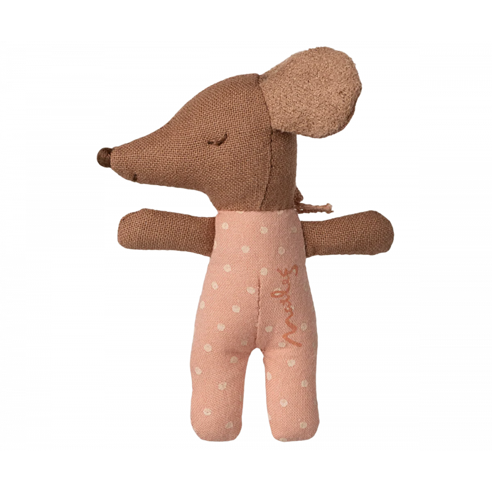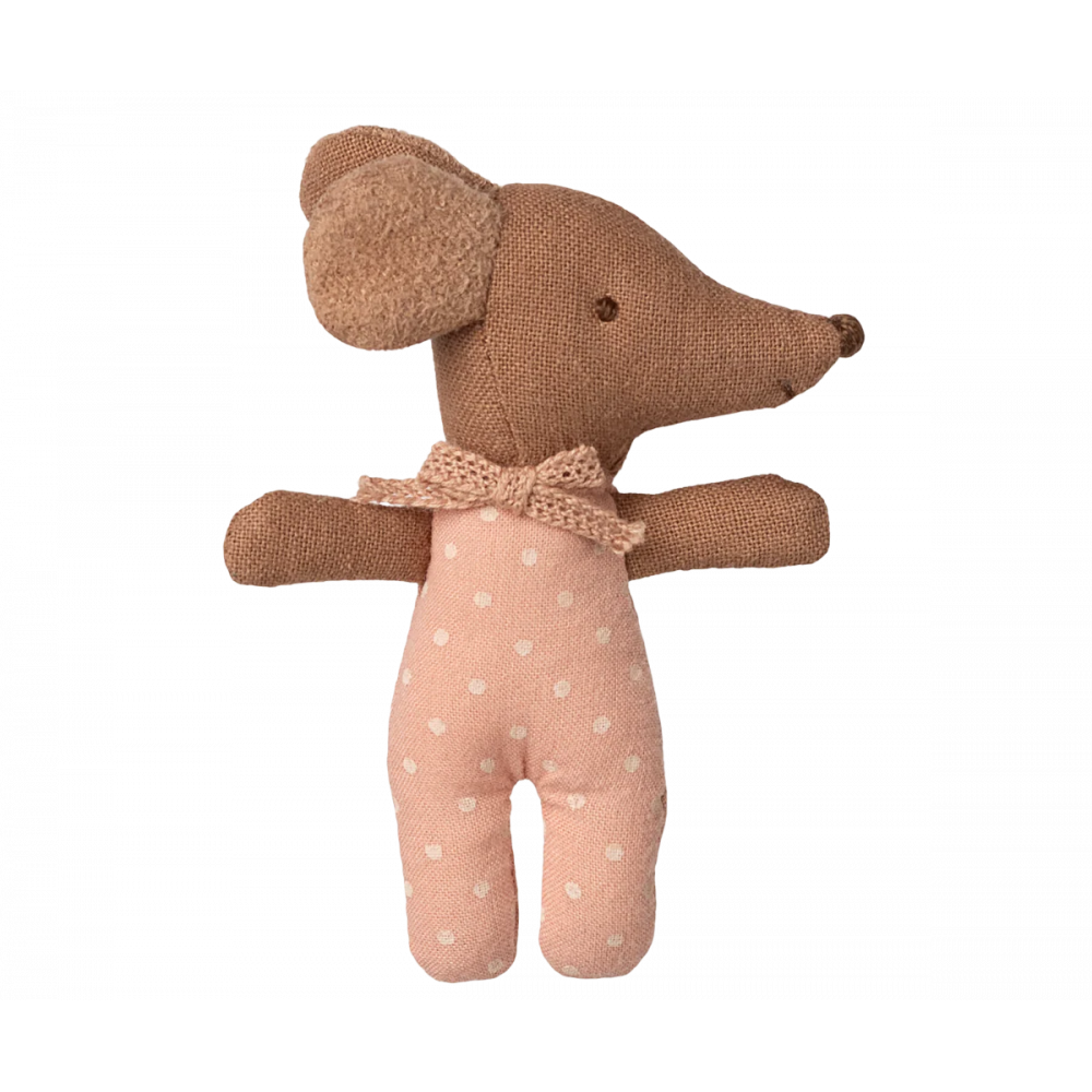 A Maileg favourite, this Baby Mouse comes tucked inside her very own matchbox bed. Dressed in a cosy spotted suit with a pink bow, she rests on soft patterned bedding, ready for sweet dreams. Her face is double-sided, with one side sleepy and the other wakey, so you can choose whether she is ready for a peaceful slumber or a day of play. Dimensions Height: 3.94in, Net weight: 0.13lb