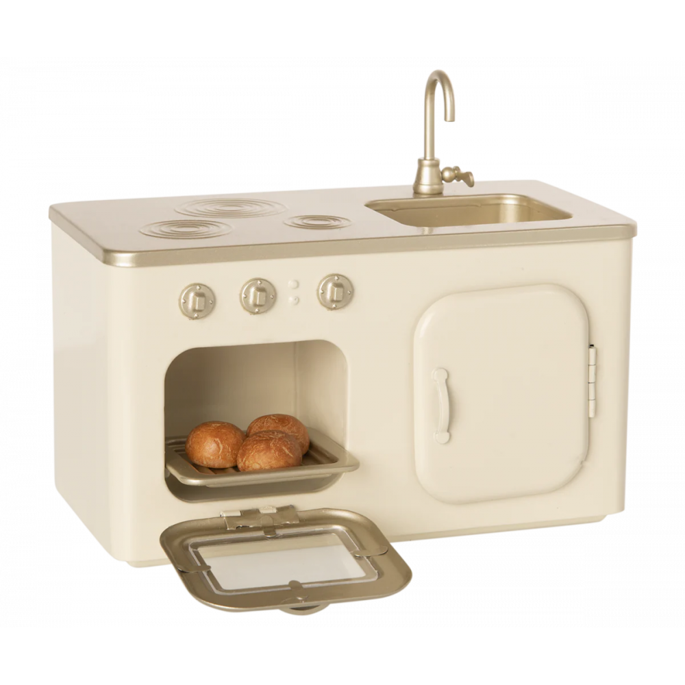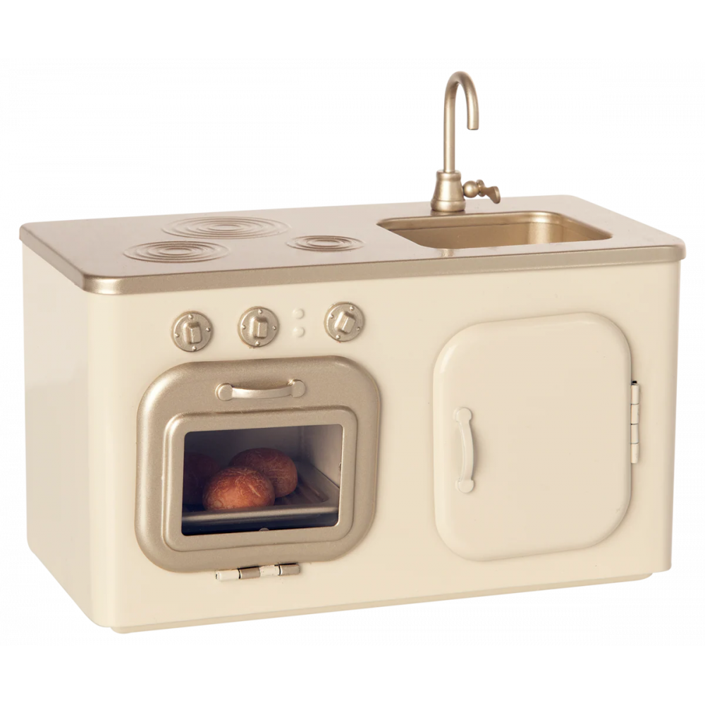 Our beautiful Maileg Miniature Kitchen is a must-have. The kitchen comes with 3 freshly baked buns in the oven. Many hours of play are secured with this wonderful product. The kitchen measures about 4 inches long by about 7 inches wide by a little over 4 inches tall. The kitchen is made of metal. Height: 4.33in, Width: 7.48in, Depth: 3.94in, Net weight: 1.46lb