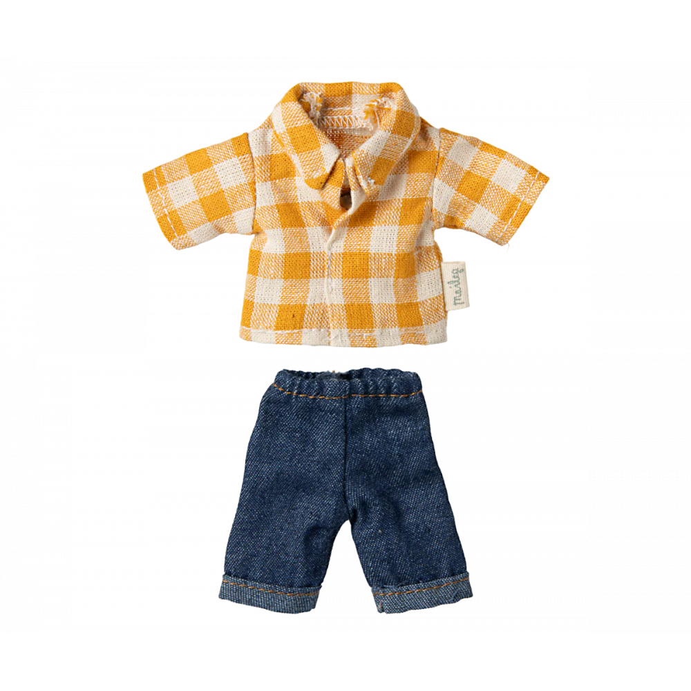If you need a new set of clothes for your mouse this set will be a good choice. This set consists of a yellow checked shirt and pants. Height: 15.00cm, Width: 8.00cm, Depth: 1.50cm, Net weight: 0.03kg