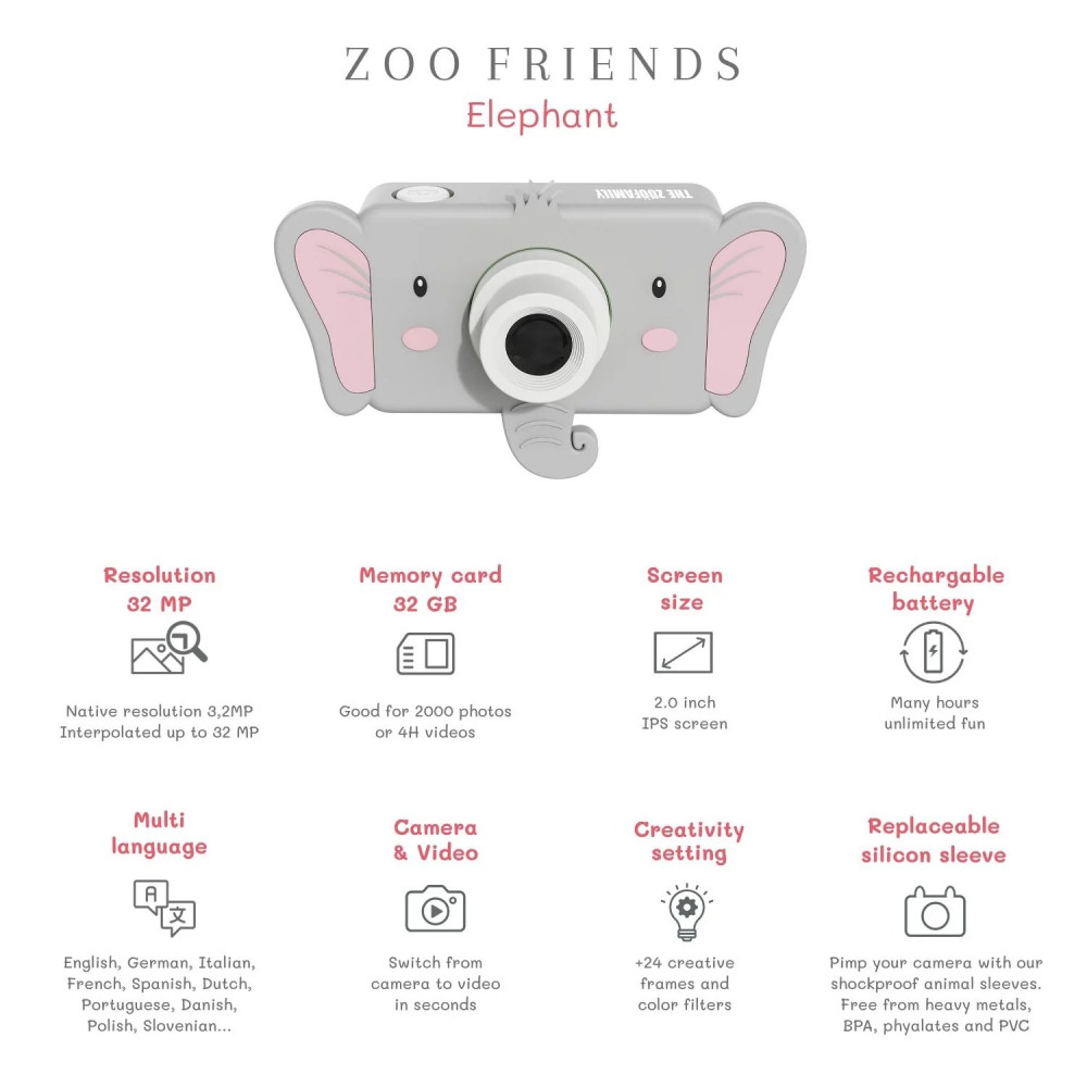 Personalize your kids camera with stickers and even 20+ camera digital filters and frames. The PVC-free, phthalate-free and eco-friendly material silicone cover is not only cute, it also protects against falling and keeps the camera clean and can be easily removed and washed. With the built-in rechargeable battery, it can run for hours before charging is needed. Fully charged can take more than 2000 photos or record about 4hrs. The Zoofamily cameras are suitable for kids starting from 3 years till 10 years and older. Don’t forget that when you buy a kid’s camera from the Zoofamily, we plant a tree! The perfect gift for all kids! 3,2MP kids digital camera (32MP interpolated) Age from 3 till 7 years. Size camera 7,9 x 4,6 x 2,1 cm 2 inch display Video and camera in one. Lightweight, easy to use, and durable. 20+ Funny photo frames and stickers. 32 GB memory card included, good for 2000 photos or 4hr videos. 1000mAh rechargeable battery. Up to 2 hours of continuous use. Removable silicon sleeve for greater protection and safety. Shockproof and durable. Multilanguage.