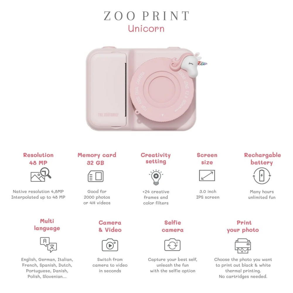Spark their curiosity with our stylish kids' instant print camera! This adorable point-and-shoot camera instantly prints black and white photos directly from the camera or stores them for later printing. Plus, with heat transfer technology, there are no expensive ink cartridges to worry about. It features a vibrant 3-inch color screen, lens protection, and high print resolution. Also available in charming unicorn, fox, and bear designs, it includes playful and cartoon stickers. Get your print in just 3 seconds! Compared to traditional instant color print cameras, our camera offers a low cost of €0.02 per print versus the usual €1 per print. You can choose to print the photo immediately, save it, or print it later. Our print paper refills are BPA-free and BPS-free, ensuring they are safe for your child and environmentally friendly. And remember, for every kid’s dino digital camera purchased from Zoofamily, we plant a tree! 4,8MP kids digital camera (48MP interpolated) Size camera 12 x 9 x 5 cm Age from 5 till 11 years Cutting edge 3 inch colourful display Video, print and camera in one. Selfie camera 2in1 necklace and charging cable included. 3 x paper rolls included, good to print up to approx. 225 photo Lightweight, easy to use, and durable. 20+ Funny photo frames and stickers. 32 GB memory card included, good for 2000 photos or 4h videos. 1500mAh rechargeable battery. Up to 2 hours of continuous use. Multilanguage