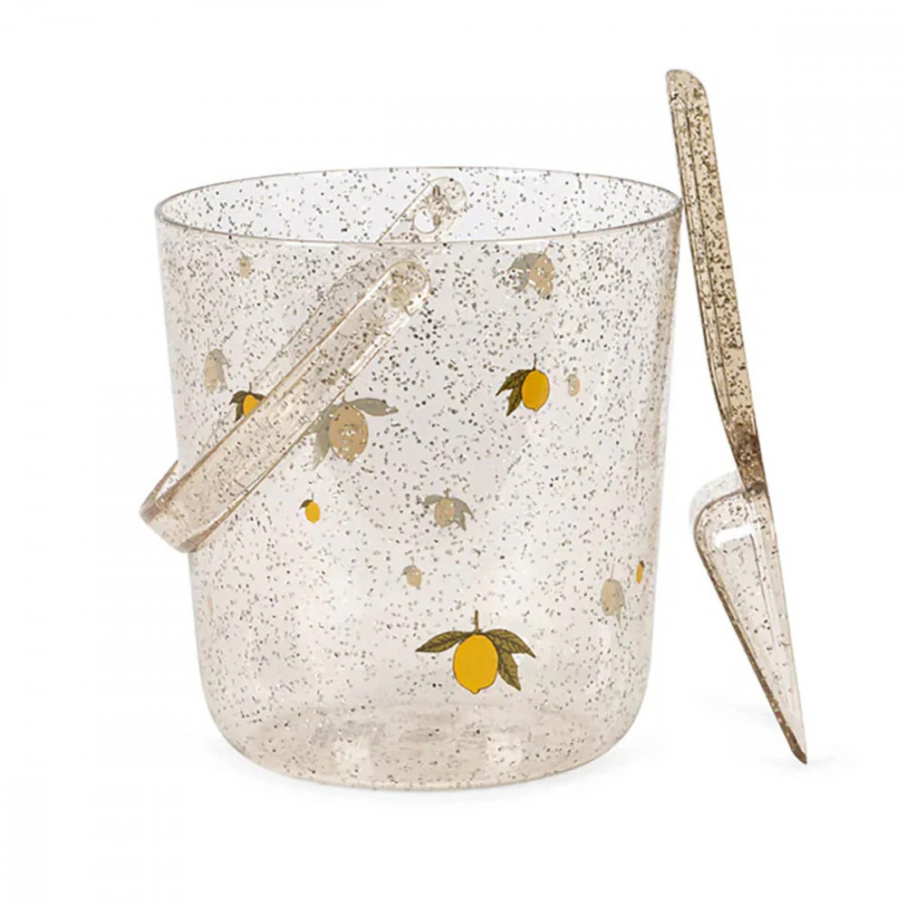 Beach set featuring a transparent bucket and shovel with glitter inside.