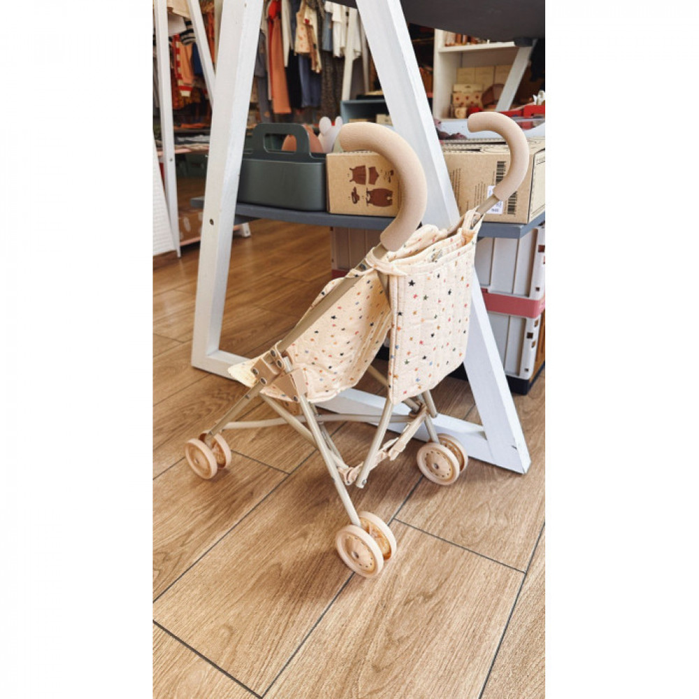 Doll stroller designed with a harness, carriage bag and double wheels on all four legs for extra stability. Features removable fabric made in 100 percent organic cotton. Comes fully assembled. Easy to fold and store. Measurements: height 56 cm, width 27 cm and depth 46 cm.