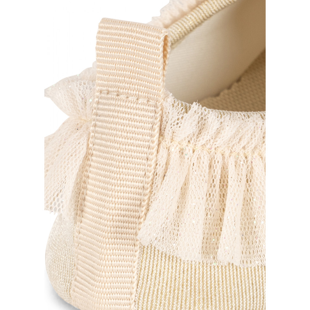 Купальні туфлі з блискітками та рюшами. Виготовлені з швидковисихаючого та гнучкого матеріалу, який щільно облягає стопу. Мають нековзну гумову підошву для надійного опору. Захищають маленькі ніжки від сонячних ультрафіолетових променів з найвищим фактором захисту від ультрафіолету UPF 40+. Захищені лише закриті ділянки. Захист може знизитися під час використання, розтягування або коли вони вологі. Вплив сонця може сприяти пошкодженню шкіри.