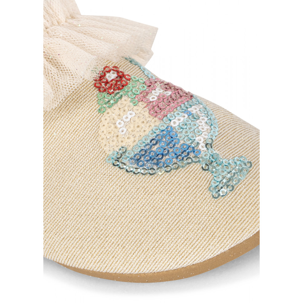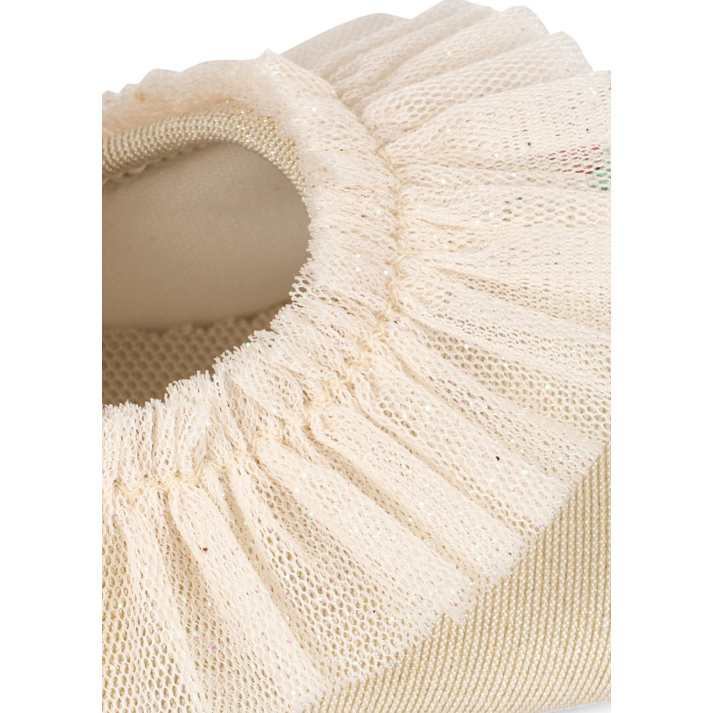 Купальні туфлі з блискітками та рюшами. Виготовлені з швидковисихаючого та гнучкого матеріалу, який щільно облягає стопу. Мають нековзну гумову підошву для надійного опору. Захищають маленькі ніжки від сонячних ультрафіолетових променів з найвищим фактором захисту від ультрафіолету UPF 40+. Захищені лише закриті ділянки. Захист може знизитися під час використання, розтягування або коли вони вологі. Вплив сонця може сприяти пошкодженню шкіри.