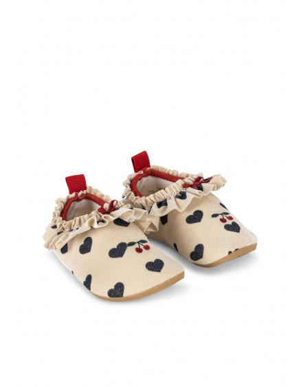 Купальні туфлі з рюшами. Виготовлені з швидковисихаючого та гнучкого матеріалу, який щільно облягає стопу. Мають нековзну гумову підошву для надійного стопи. Захищають маленькі ніжки від сонячних ультрафіолетових променів завдяки найвищому фактору захисту від ультрафіолету UPF 40+.