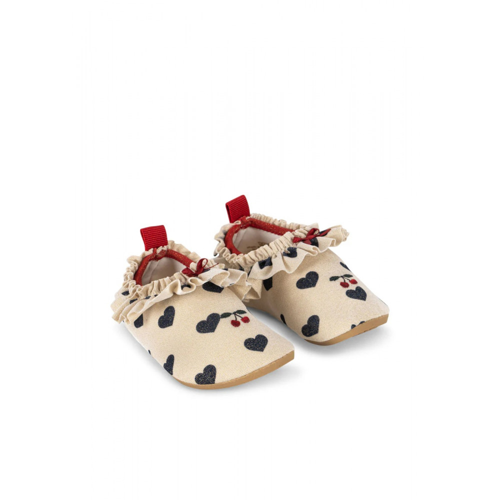 Купальні туфлі з рюшами. Виготовлені з швидковисихаючого та гнучкого матеріалу, який щільно облягає стопу. Мають нековзну гумову підошву для надійного стопи. Захищають маленькі ніжки від сонячних ультрафіолетових променів завдяки найвищому фактору захисту від ультрафіолету UPF 40+.