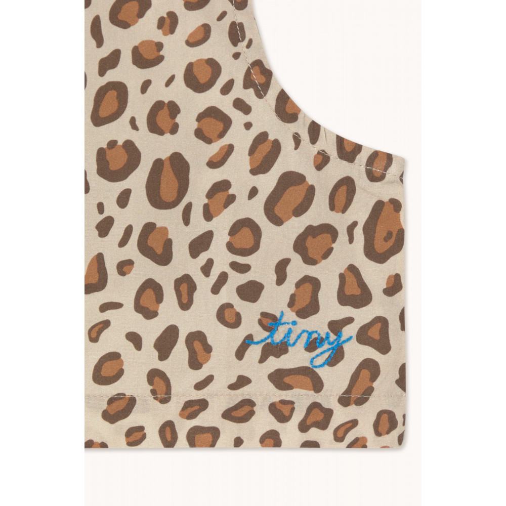 Цей короткий топ з анімалістичним принтом на темно-ванільній основі поєднує простоту та стиль у свіжому, літньому дизайні. Без рукавів, з круглим вирізом горловини, має невелику петлицю ззаду із застібкою на ґудзики для зручного одягання. Ідеально підходить для невимушеного образу, сповненого індивідуальності.