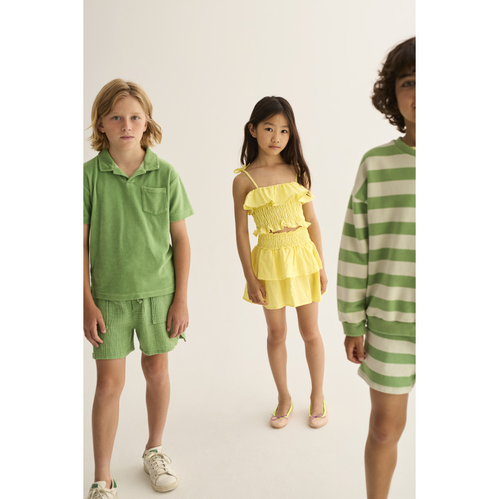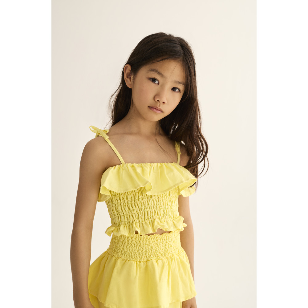 Топ з повітропроникної суміші бавовни та льону. Ліф з облямівкою. Верхня частина з рюшами. Бретелі, що зав'язуються на плечах.