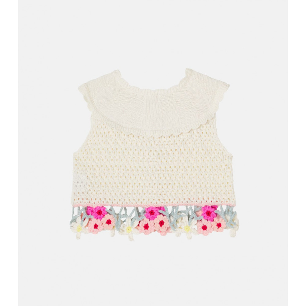 Светр-безрукавка Elea від Louise Misha вирізняється яскравою квітковою вишивкою на обробці та ажурною в'язкою по всій поверхні. Дизайн виготовлений з бавовни та оздоблений фестончастим коміром у стилі Пітера Пена.