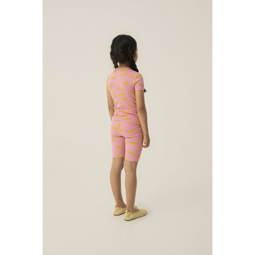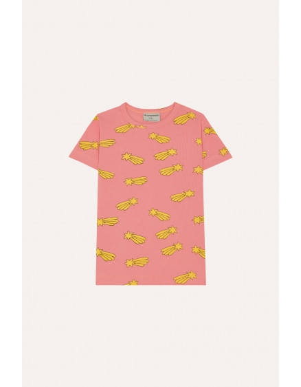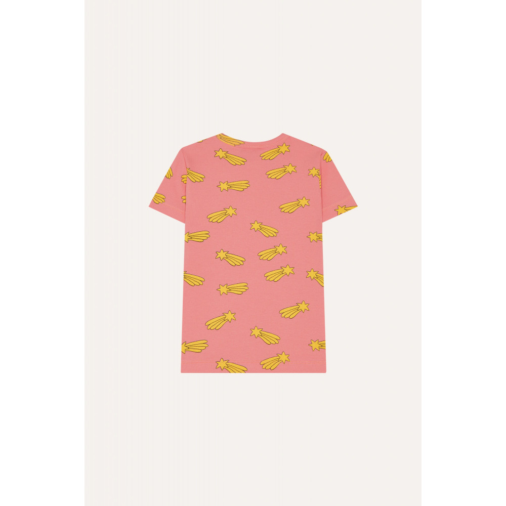 Ця рожева футболка з падаючими зірками, виготовлена з м'якої ребристої тканини, приталеного крою ідеально підходить для сонячних днів. Комір виготовлений з ребристої тканини для додаткового комфорту.