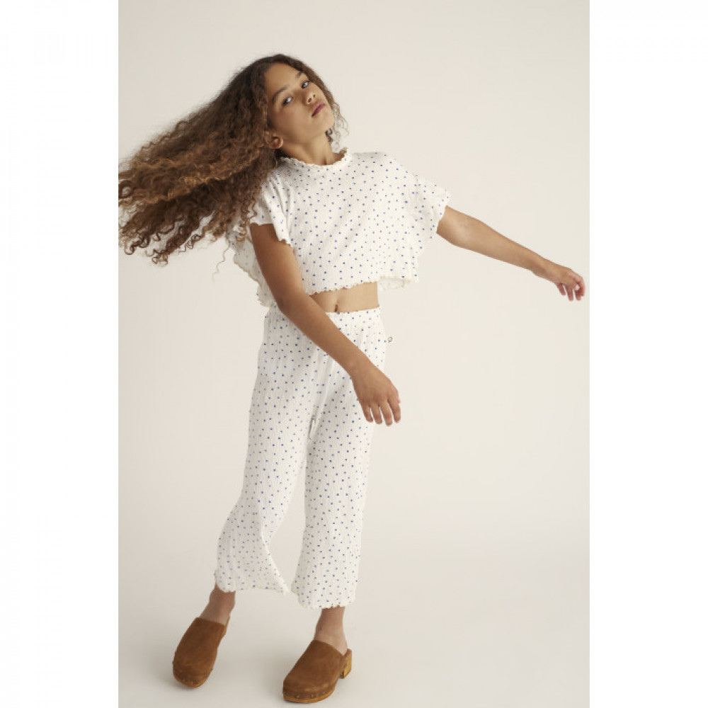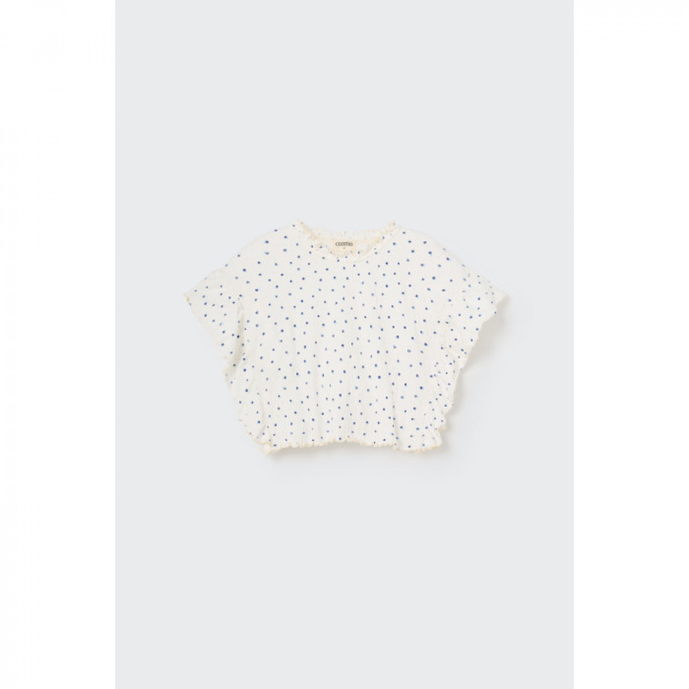 Еластичний комір з оборками. Рукава з оборками. Прямий поділ. Природно зморшкувата тканина з дрібним квітковим малюнком.